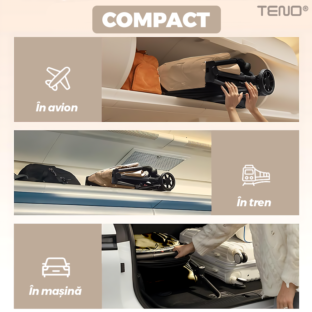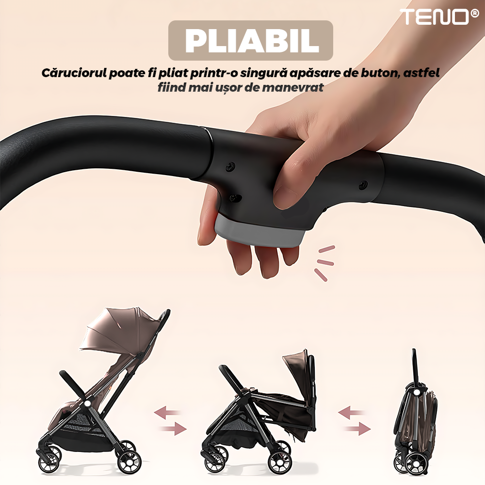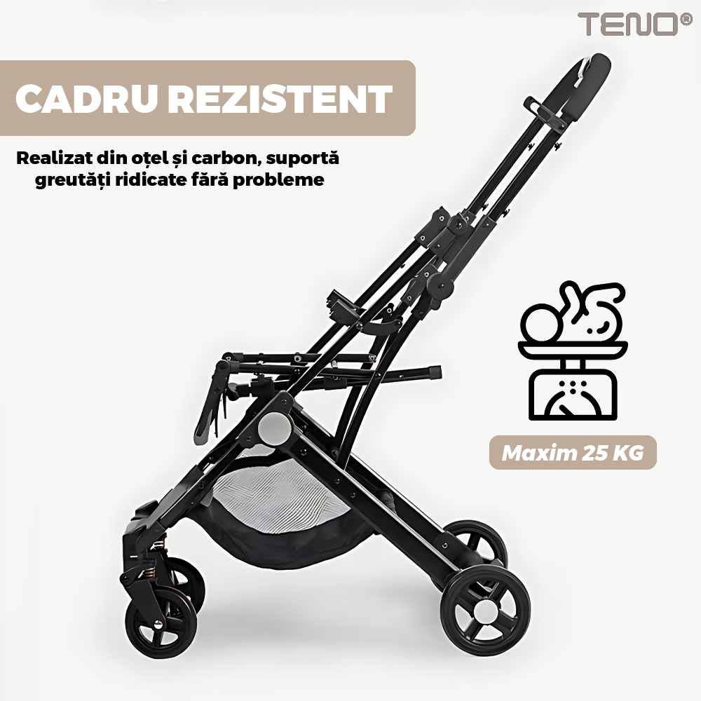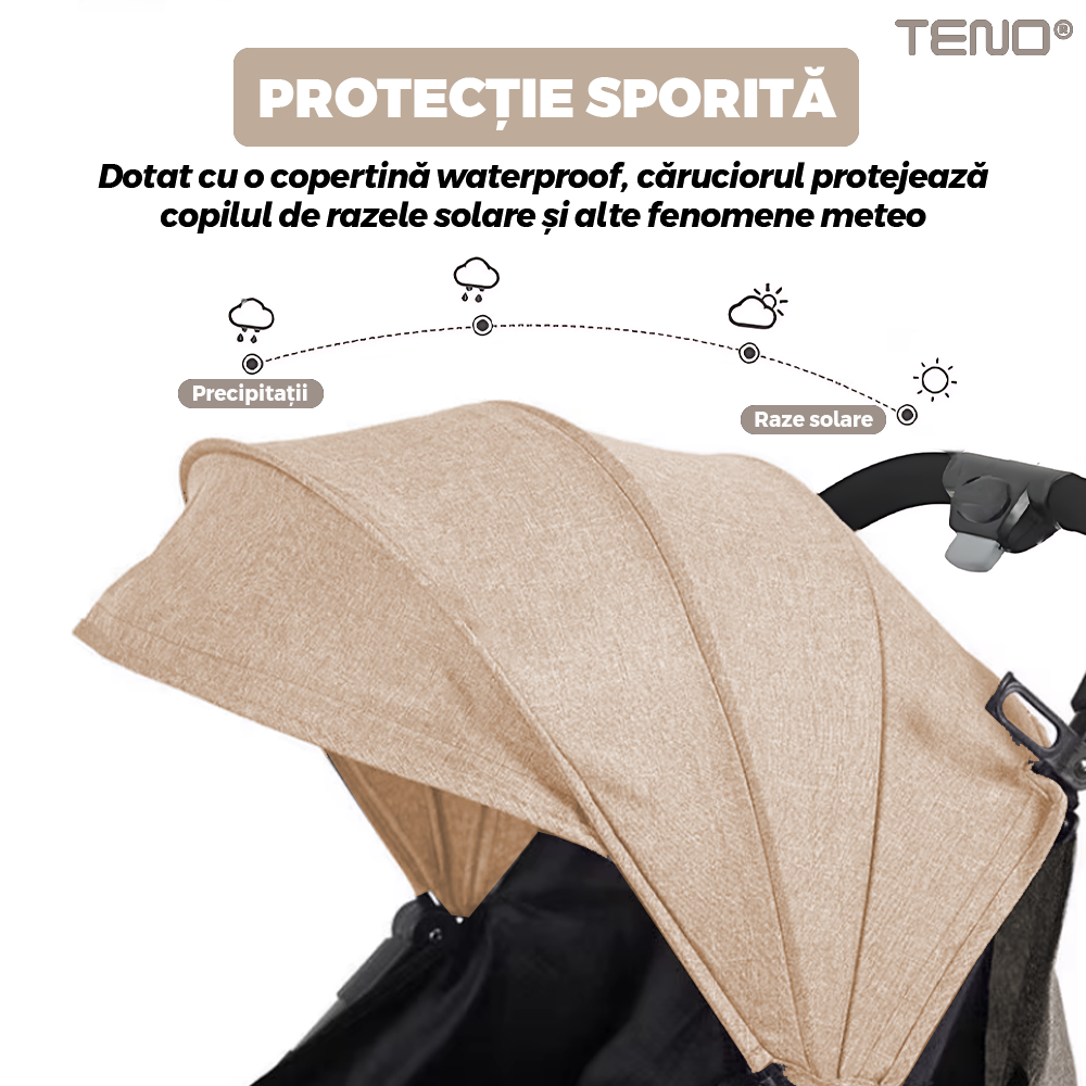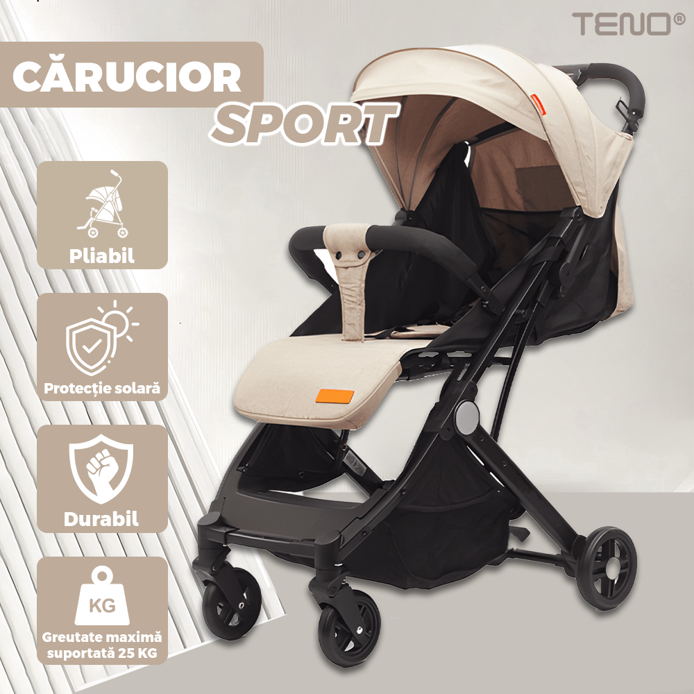 Carucior Sport pentru Bebeluși Teno2030, pliabil, usor de carat, sezut reglabil, spatios, cosulet dorsal, copertina retractabila, greutate maxima suportata 25 kg, bej