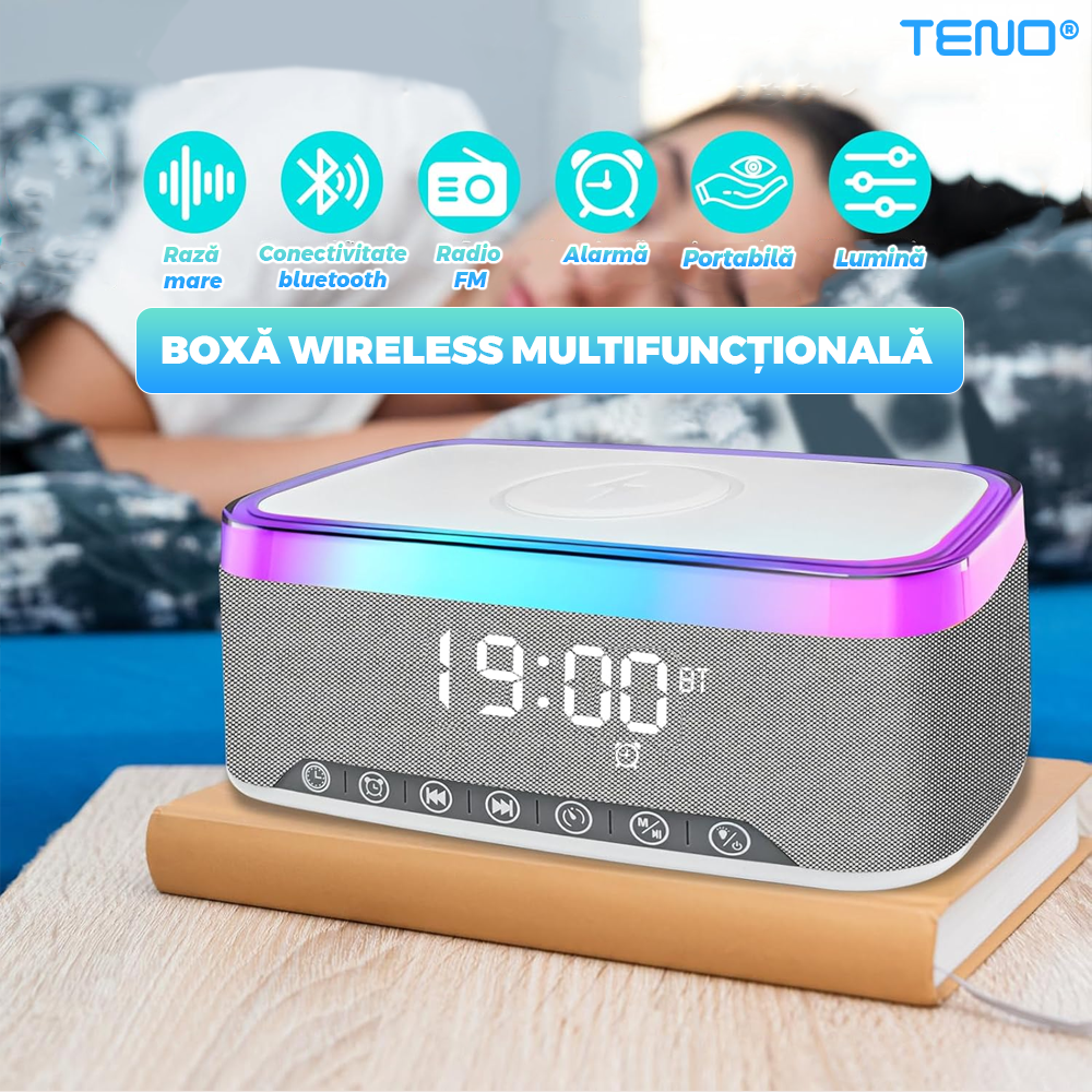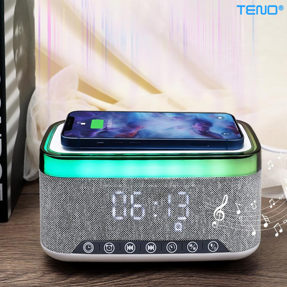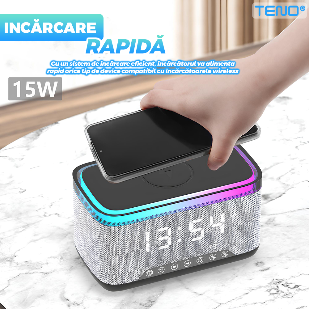 Boxa Multifunctionala 3 in 1 Teno1942, lumina RBG, incarcator de gadgeturi wireless, functie de radio, functie de ceas, Bluetooth 5.3, suport de telefon, gri