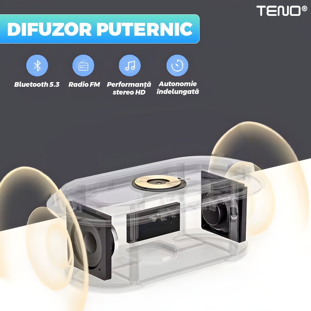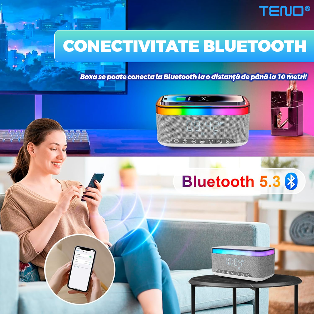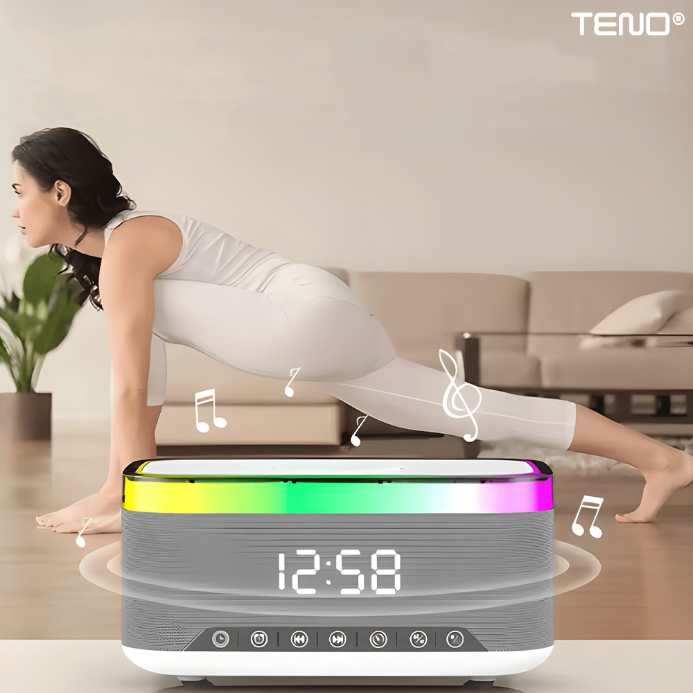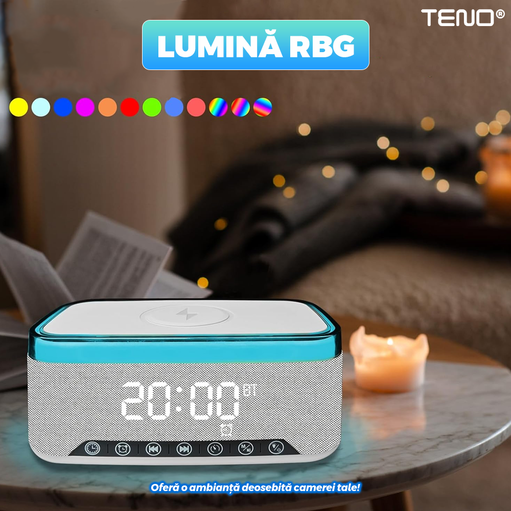 Boxa Multifunctionala 3 in 1 Teno1942, lumina RBG, incarcator de gadgeturi wireless, functie de radio, functie de ceas, Bluetooth 5.3, suport de telefon, gri