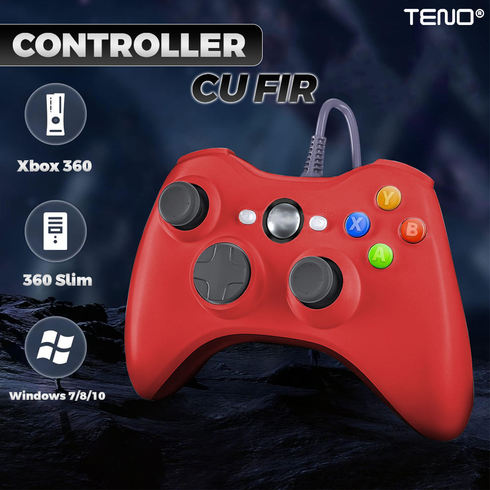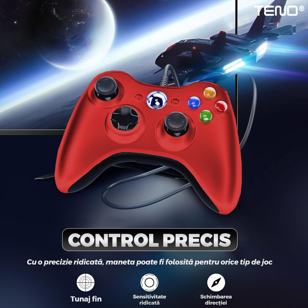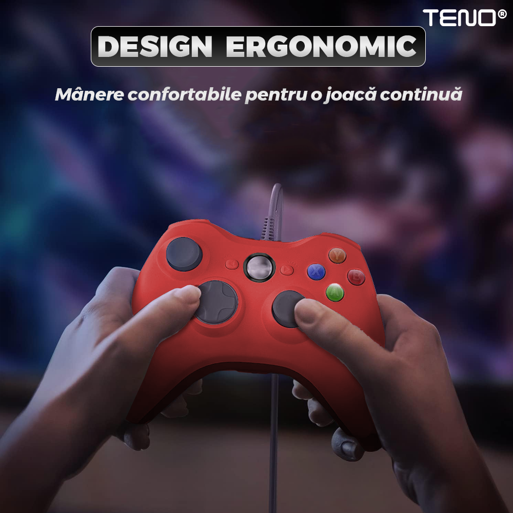 Controller de Joc cu Fir Teno2667, compatibil cu Xbox 360/Slim/PC Windows 7/8/10, vibratii duble turbo cu 3 intensitati, sensitivitate ridicata, cablu cu lungime de 2.5 m, rosu