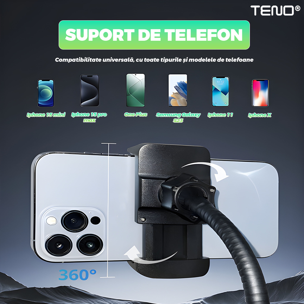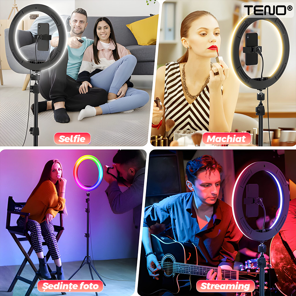 Lampa Circulara Ring Light Teno2559, Diametru 30.5cm/12 Inch, moduri RGB, 10 trepte reglaj, trepied 210 cm, suport triplu telefon, compatibilitate universala, multicolor