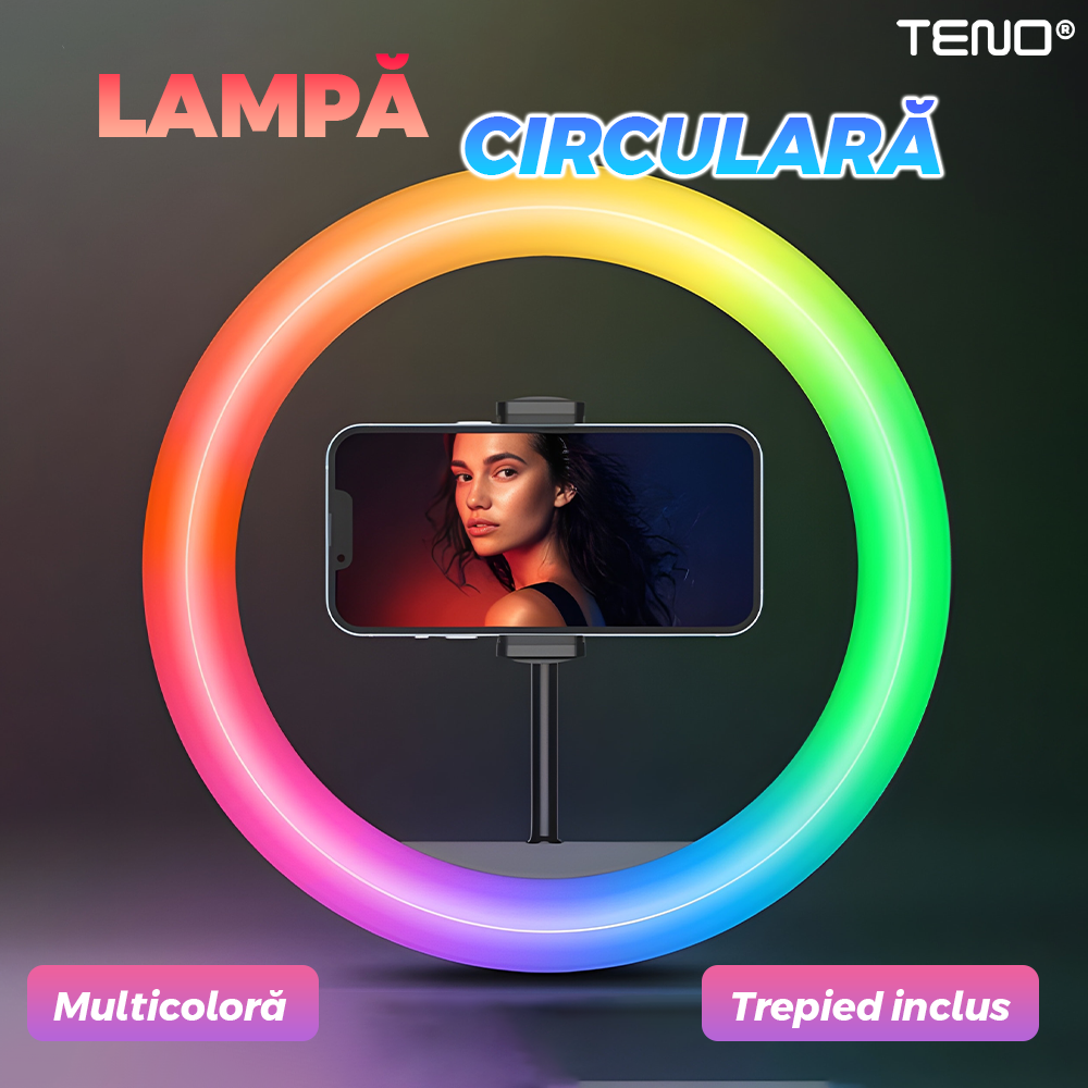 Lampa Circulara Ring Light Teno2561, Diametru 45cm/18 Inch, moduri RGB, 10 trepte reglaj, trepied 210 cm, suport triplu telefon, compatibilitate universala, multicolor