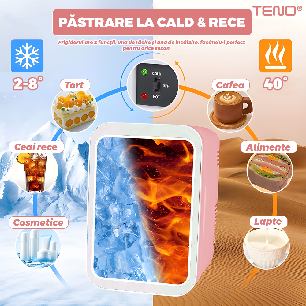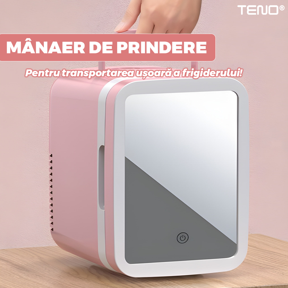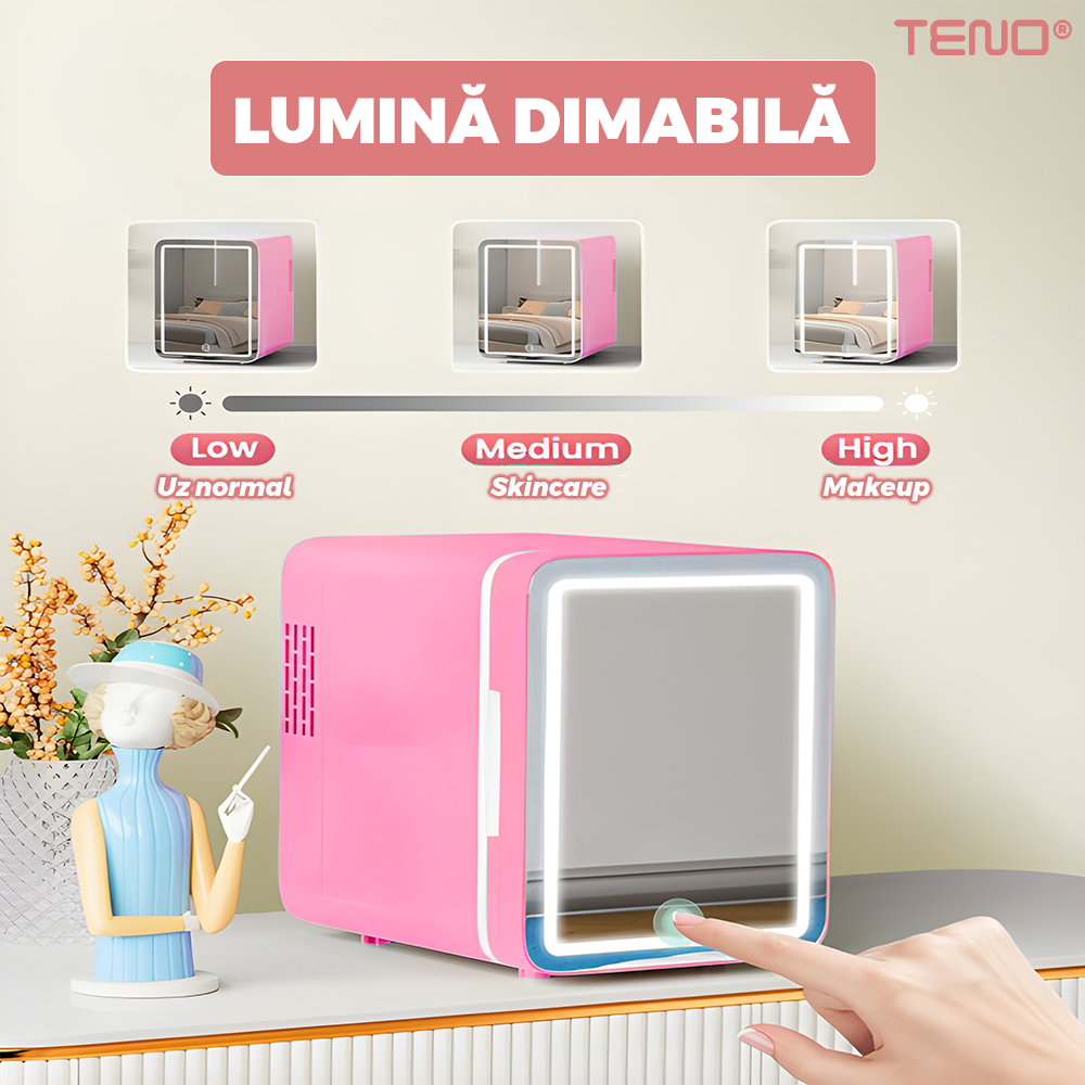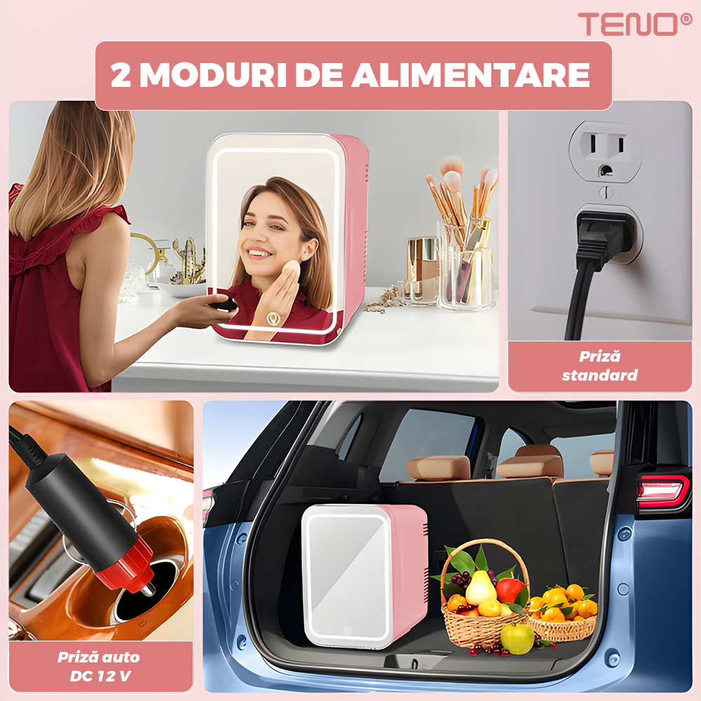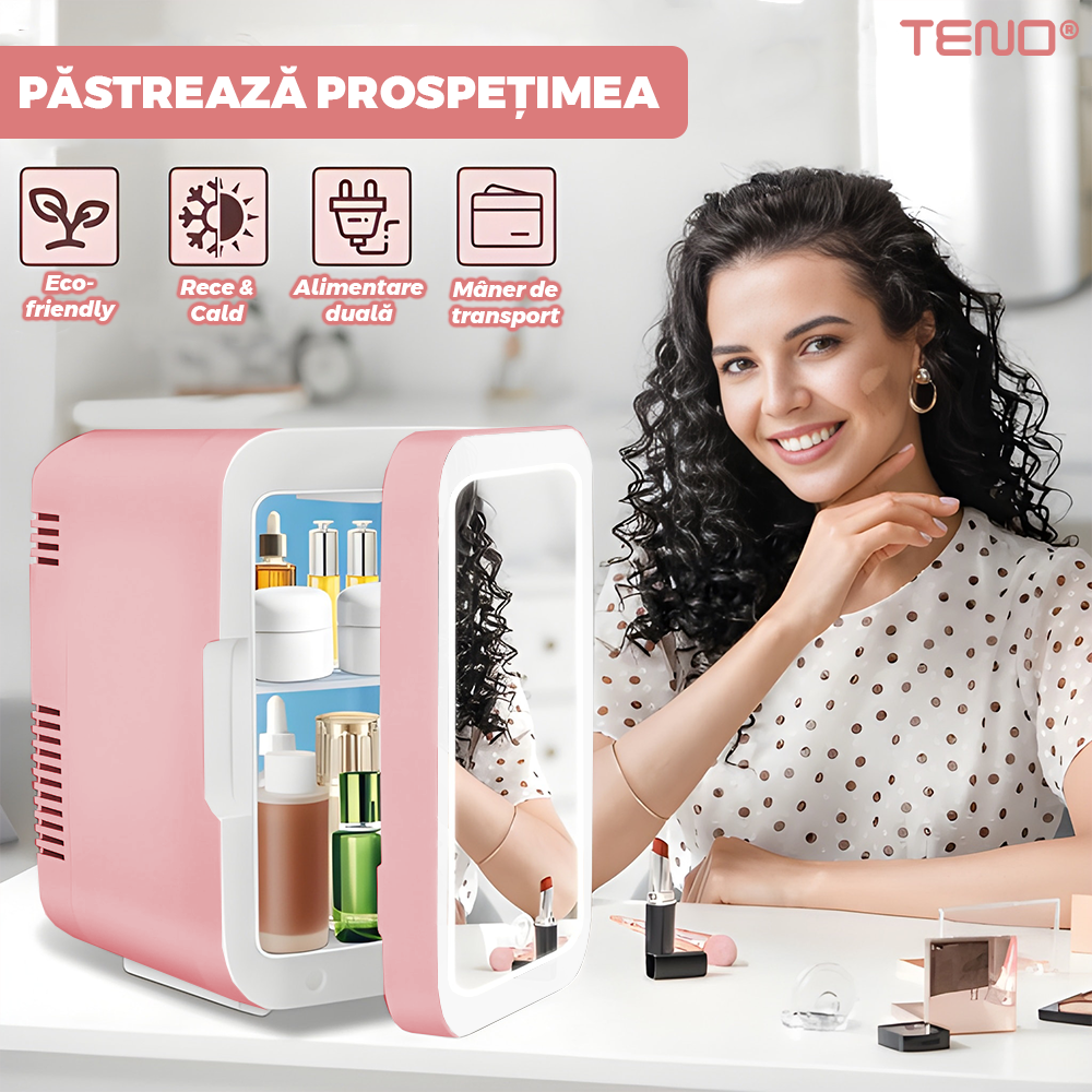 Mini Frigider Cosmetice Teno2053, portabil, functie de racire/incalzire, oglinda cosmetica. lumina LED dimabina, capacitate 4L, maner de prindere, 2 moduri de alimentare, roz