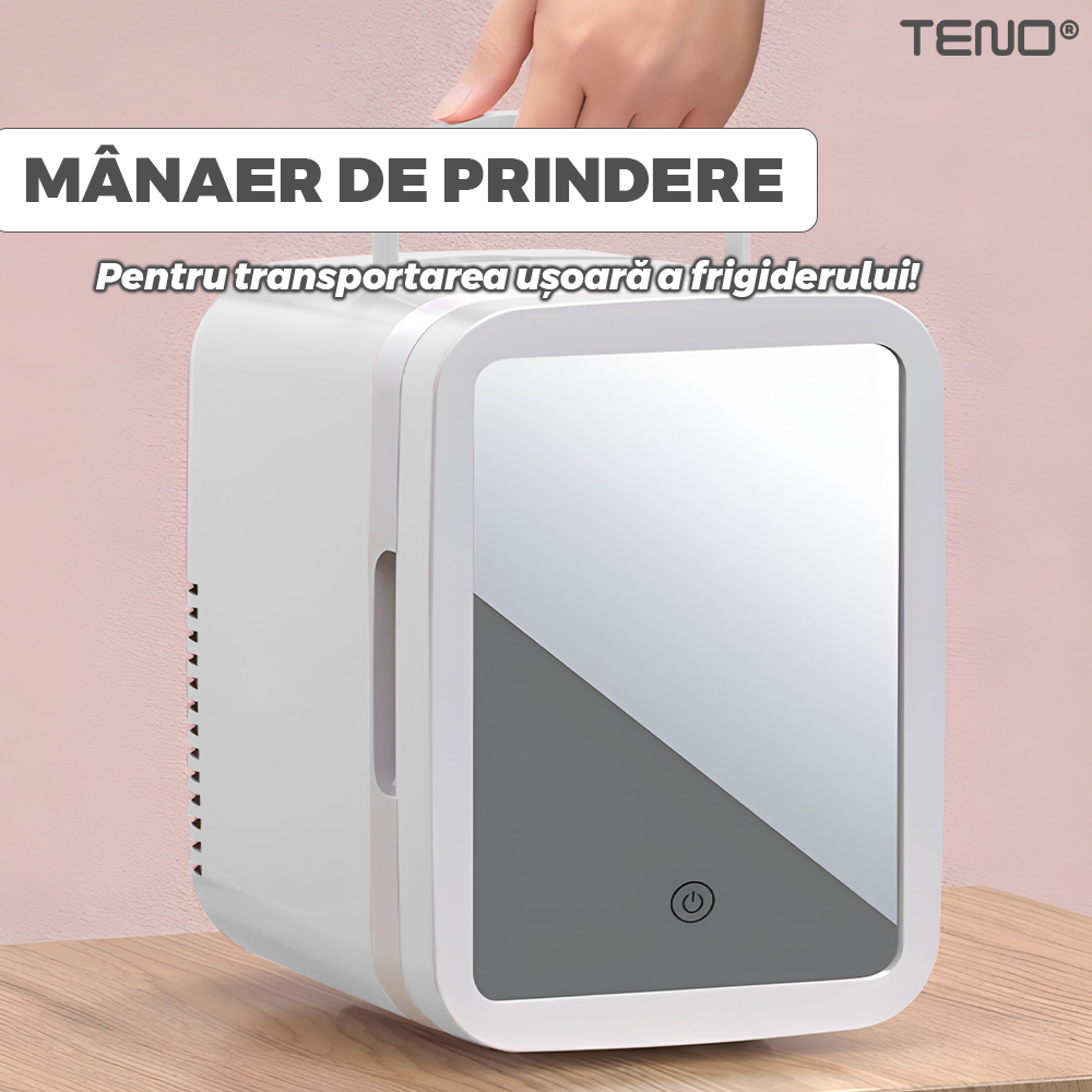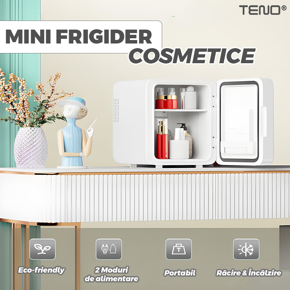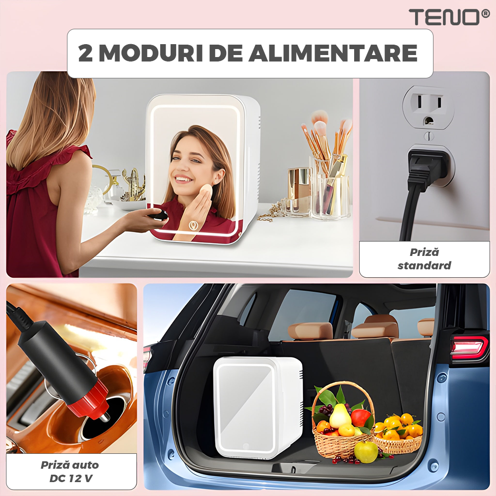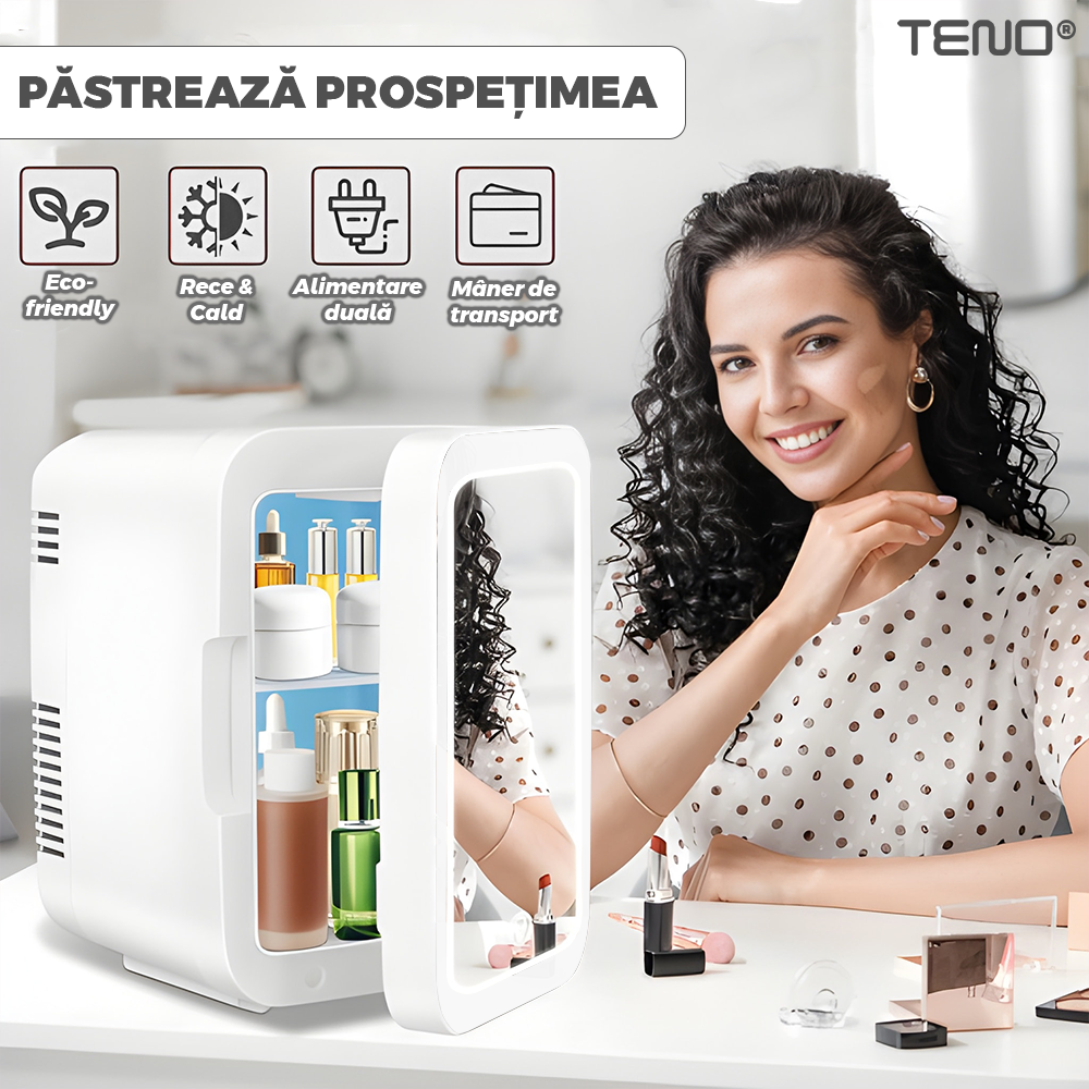 Mini Frigider Cosmetice Teno2054, portabil, functie de racire/incalzire, oglinda cosmetica. lumina LED dimabina, capacitate 4L, maner de prindere, 2 moduri de alimentare, alb