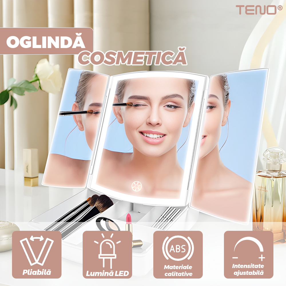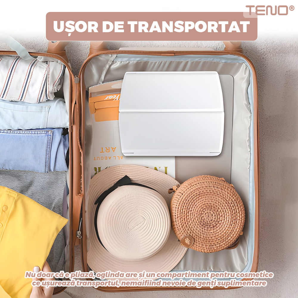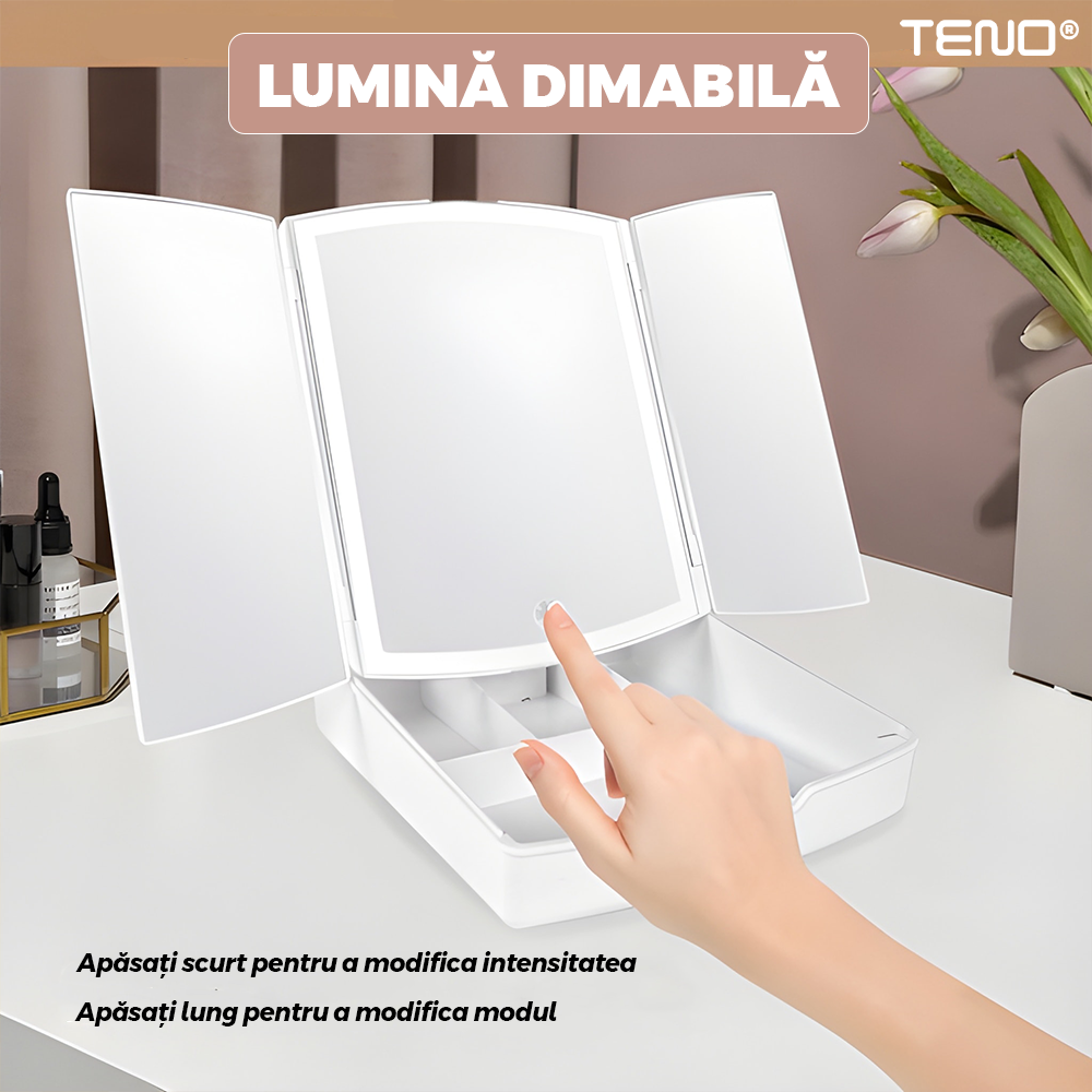 Oglinda Cosmetica Teno2042, iluminare LED, pliabila, suport pentru machiaje, reincarcabila, usor de transportat, portabila, materiale calitative, alb