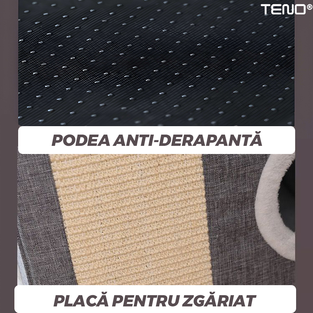 Este prevazuta cu o podea anti derapanta, care ofera stabilitate si siguranta, prevenind alunecarea chiar si atunci cand pisica se misca brusc sau sare.