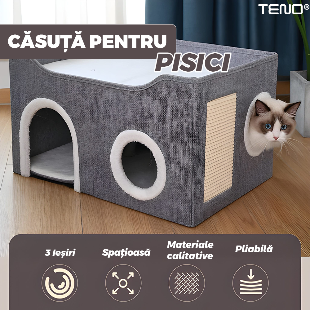 Casuta este potrivita pentru pisici de toate varstele, de la pui curiosi si energici, pana la pisici adulte care cauta liniste si confort.