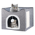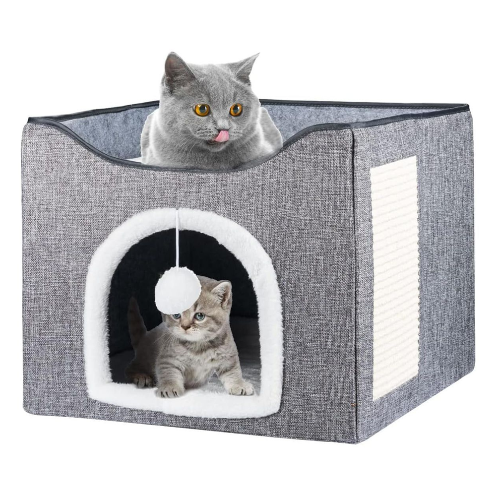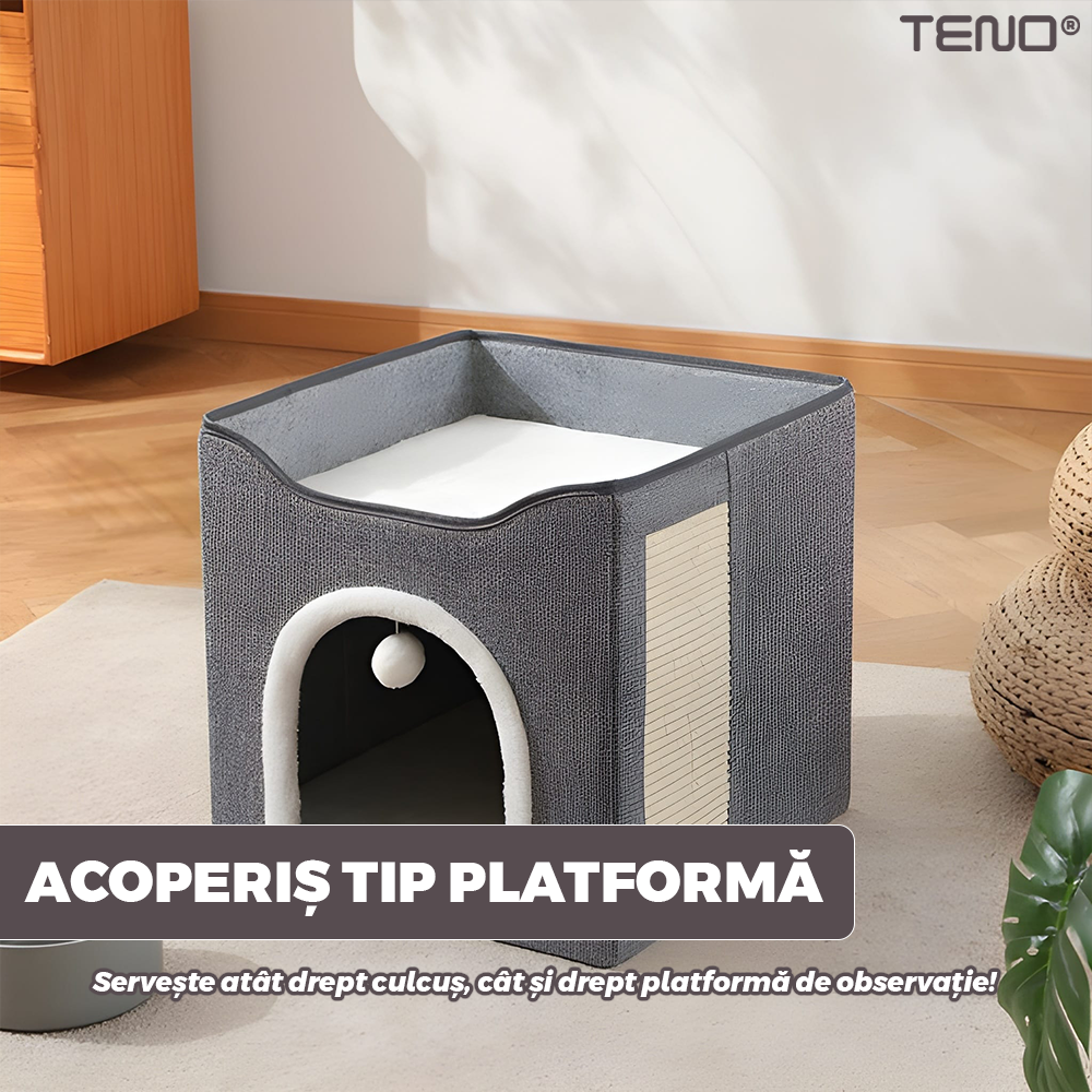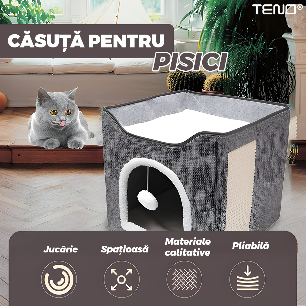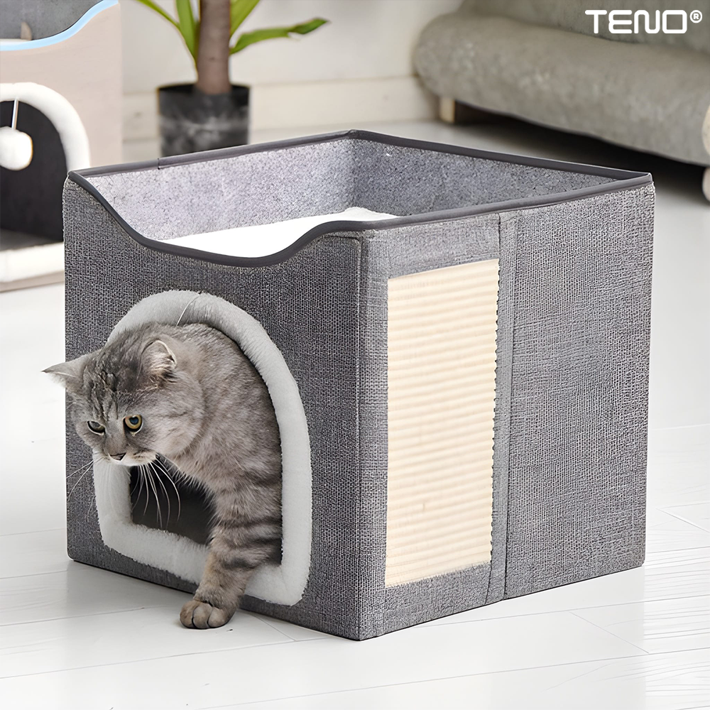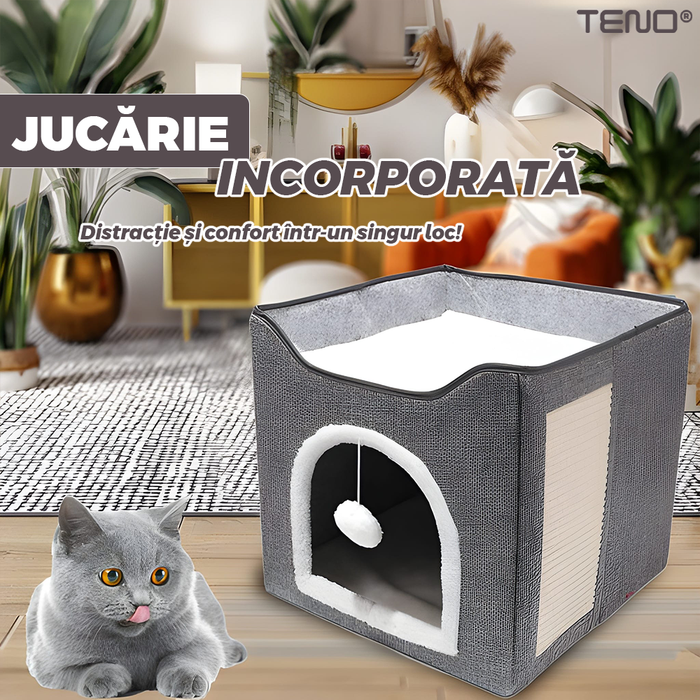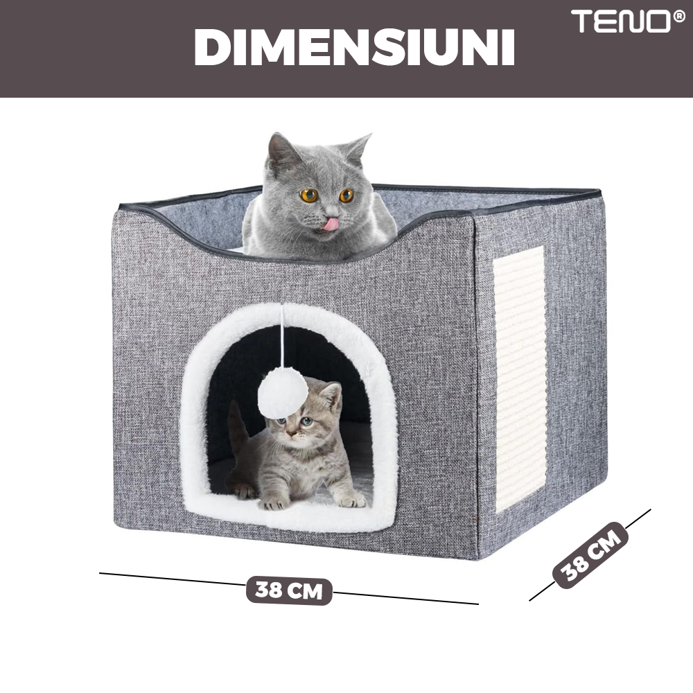 Casuta pentru Pisici Teno1893, de interior, pentru caini/pisici/animale mici, baza anti-alunecare, culcus pufos, pliabila, placa pentru zgariat, usor de montat, 38 x 38 cm, gri