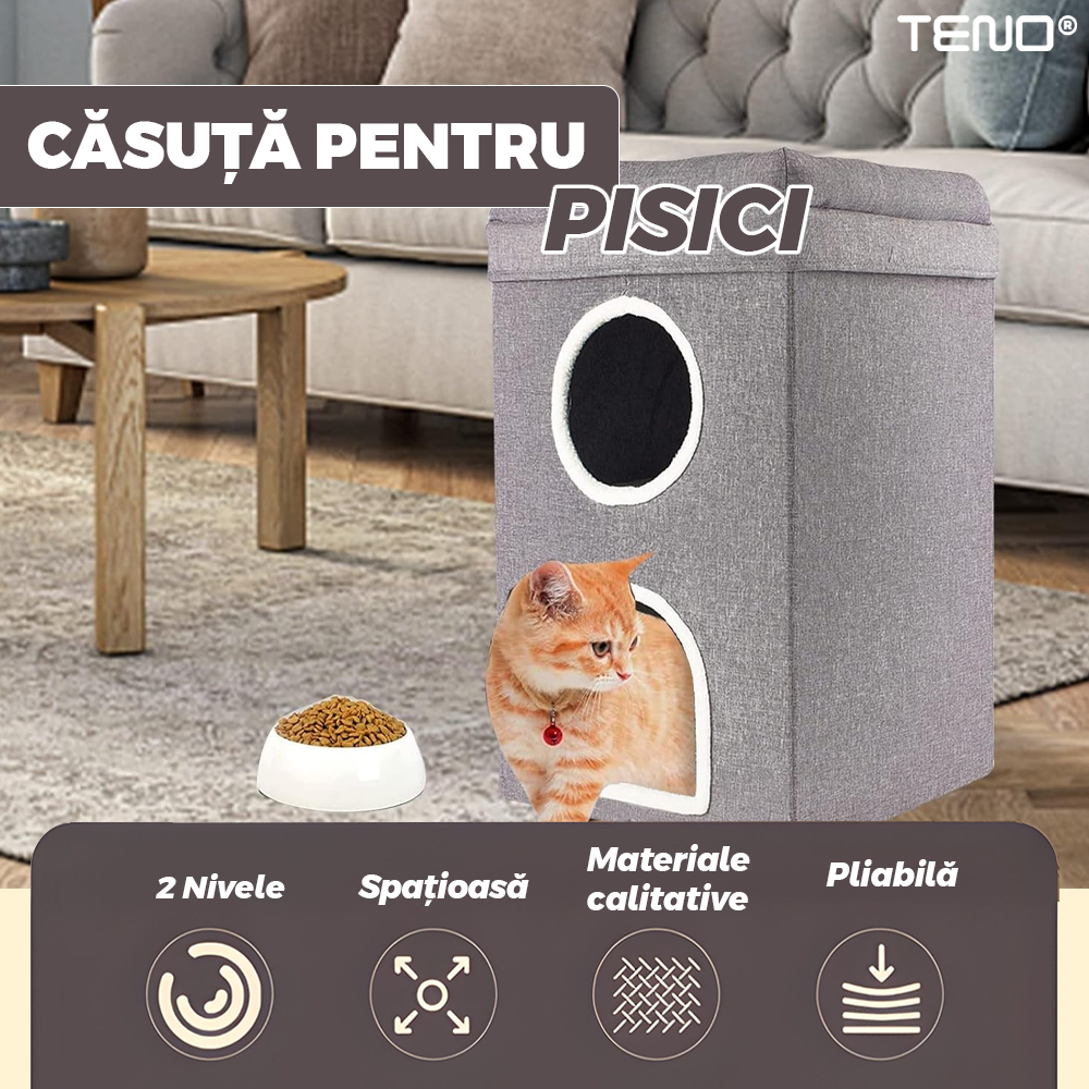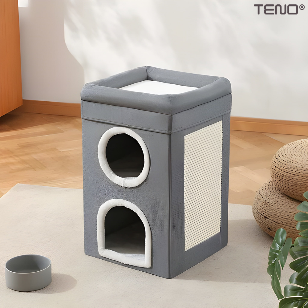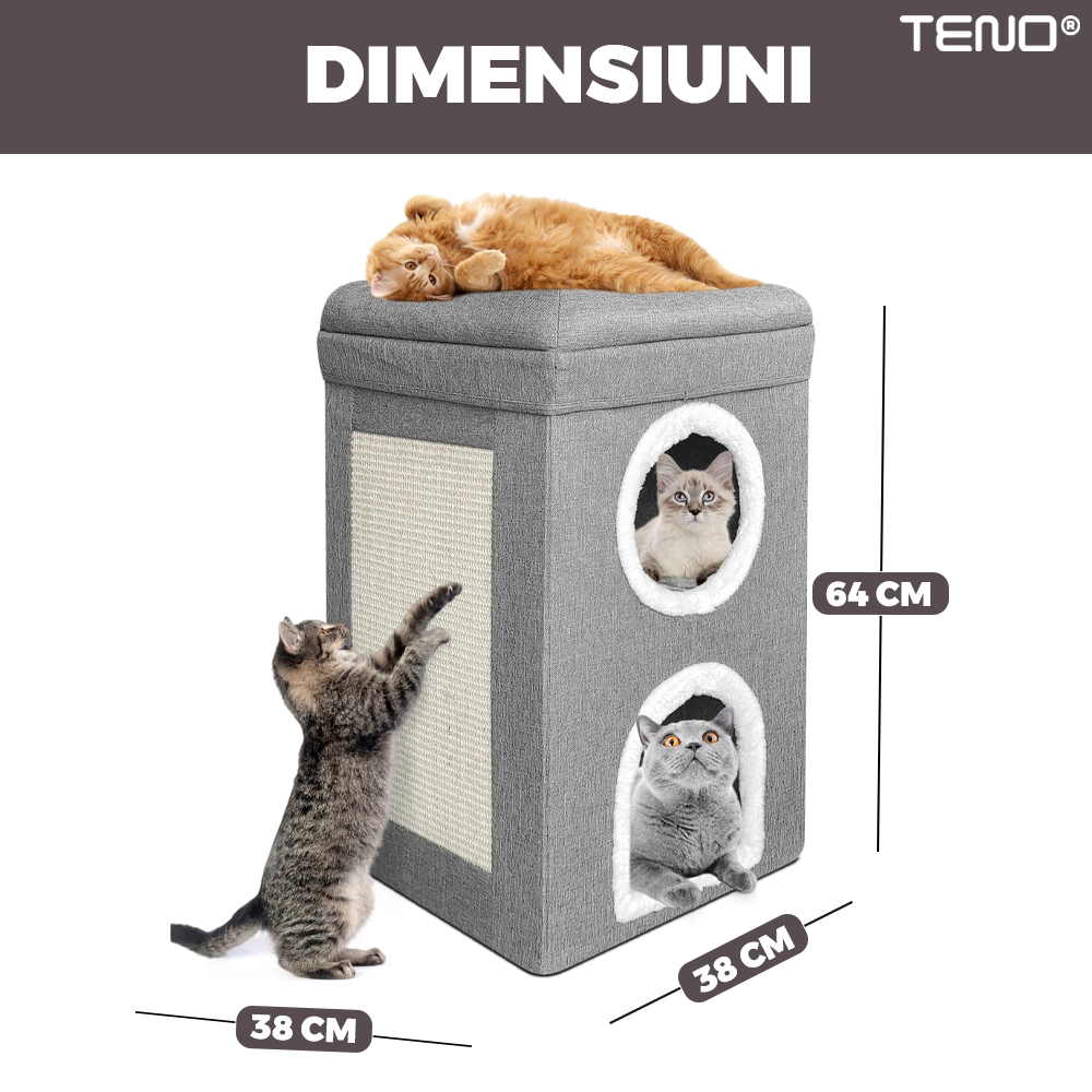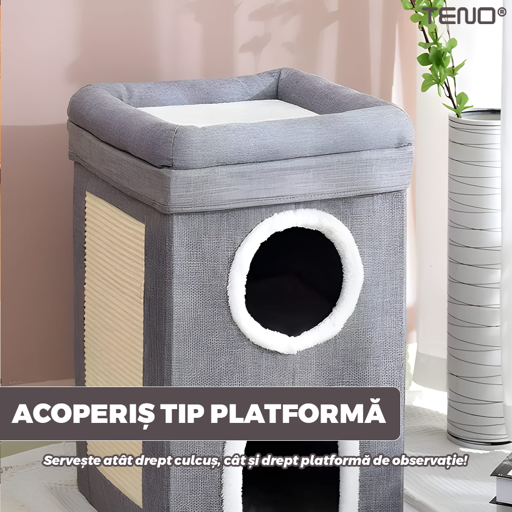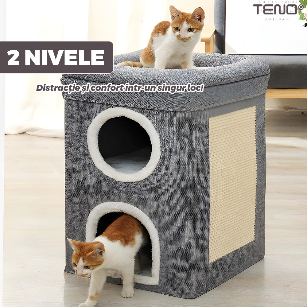 Casuta pentru Pisici Teno1894, de interior, 2 nivele, pentru caini/pisici/animale mici, baza anti-alunecare, culcus pufos, pliabila, placa pentru zgariat, usor de montat, 38 x 38 x 64 cm, gri