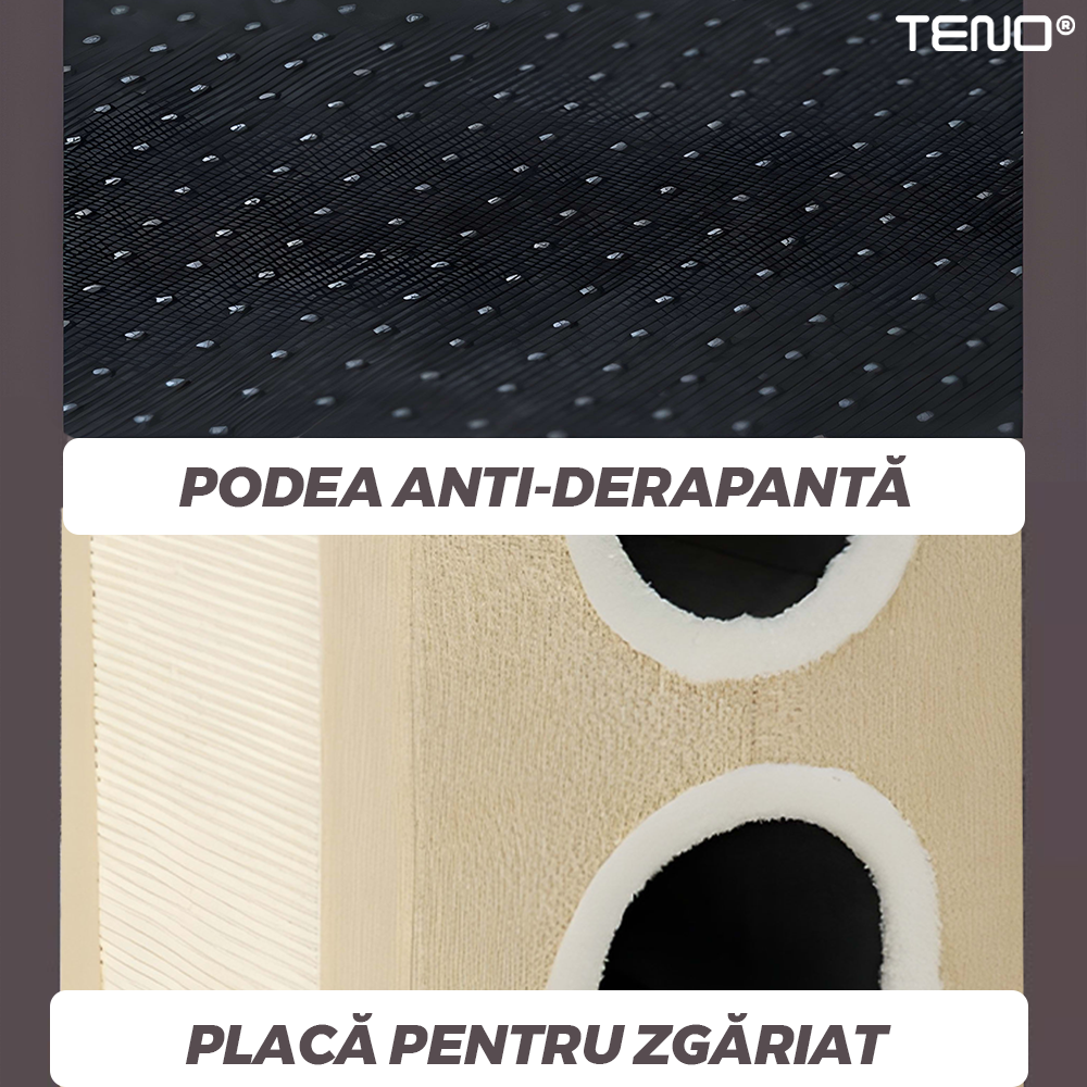 Este prevazuta cu o podea anti derapanta, care ofera stabilitate si siguranta, prevenind alunecarea chiar si atunci cand pisica se misca brusc sau sare.