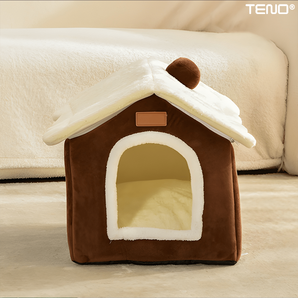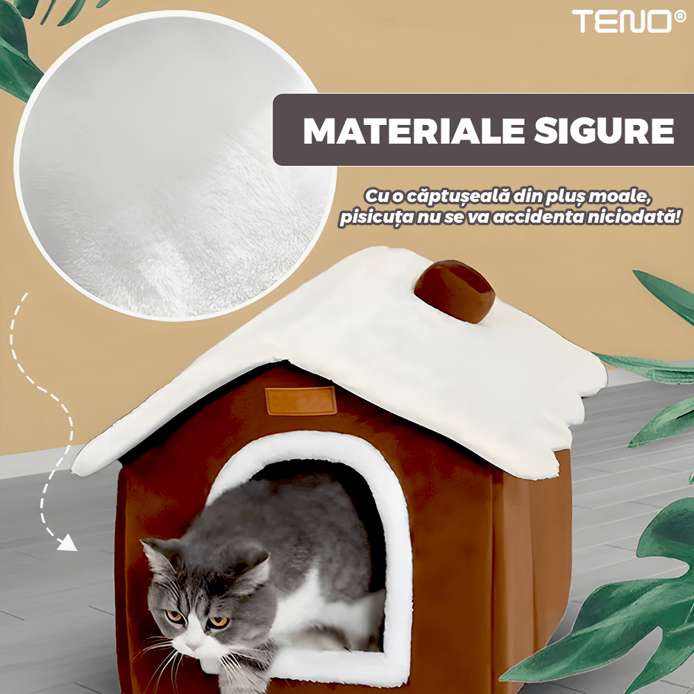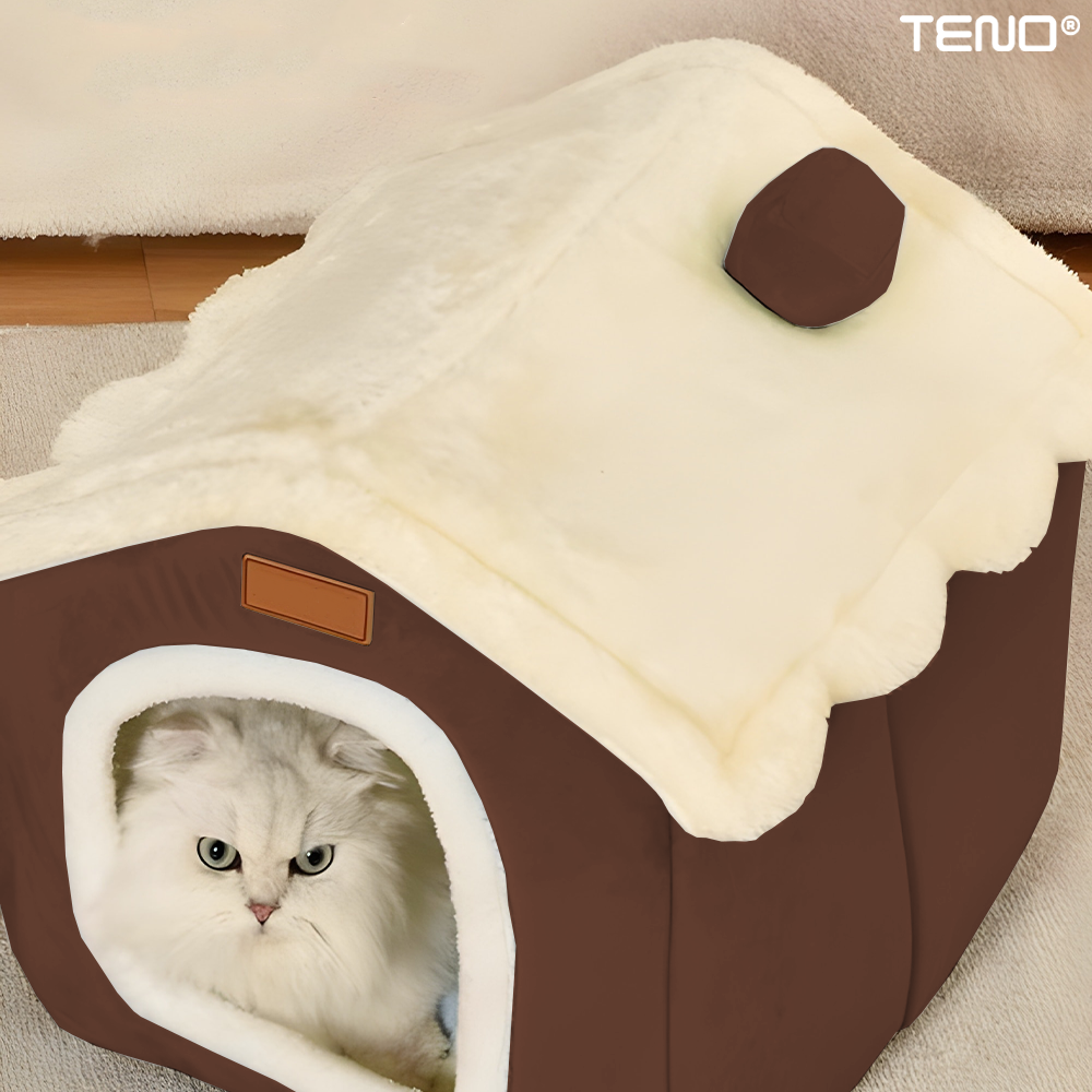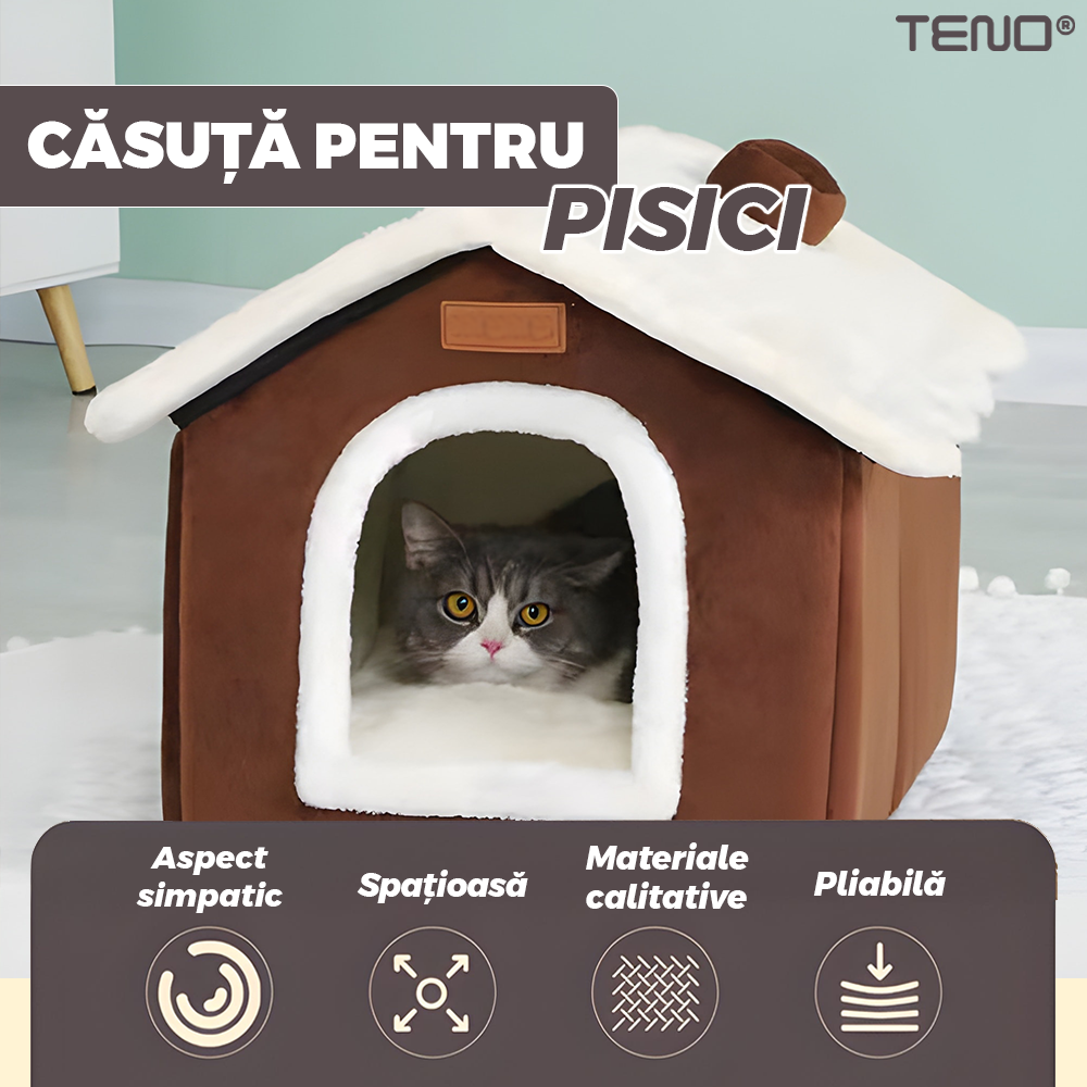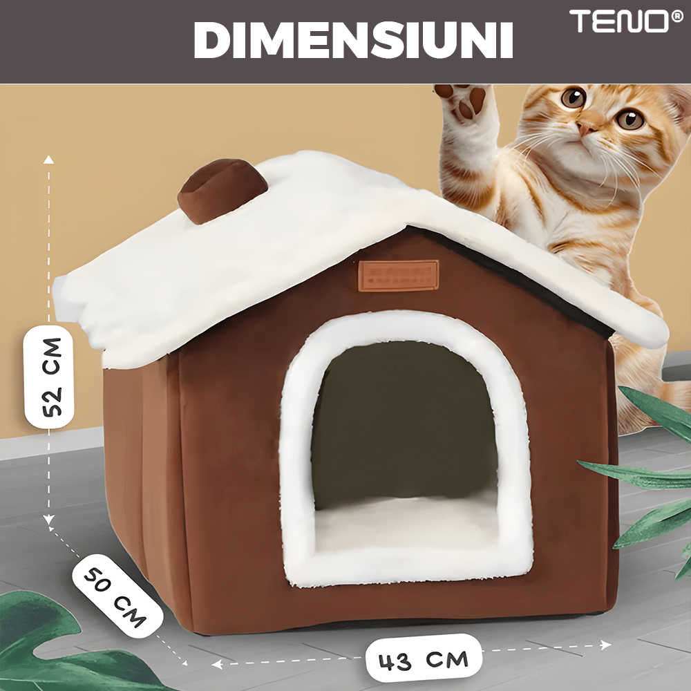 Casuta pentru Pisici Teno1896, de interior, pentru caini/pisici/animale mici, baza anti-alunecare, culcus pufos, pliabila, pernuta inclusa, usor de montat, 43 x 50 x 52 cm, maro