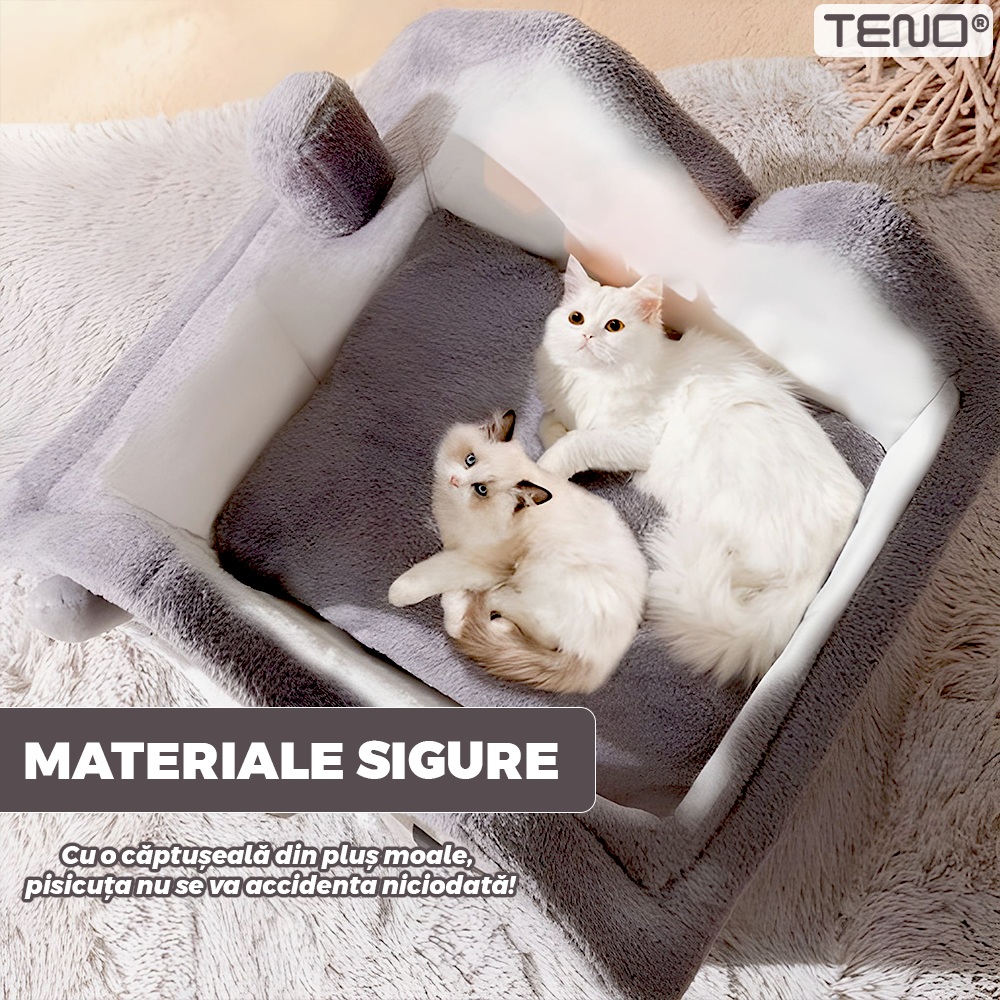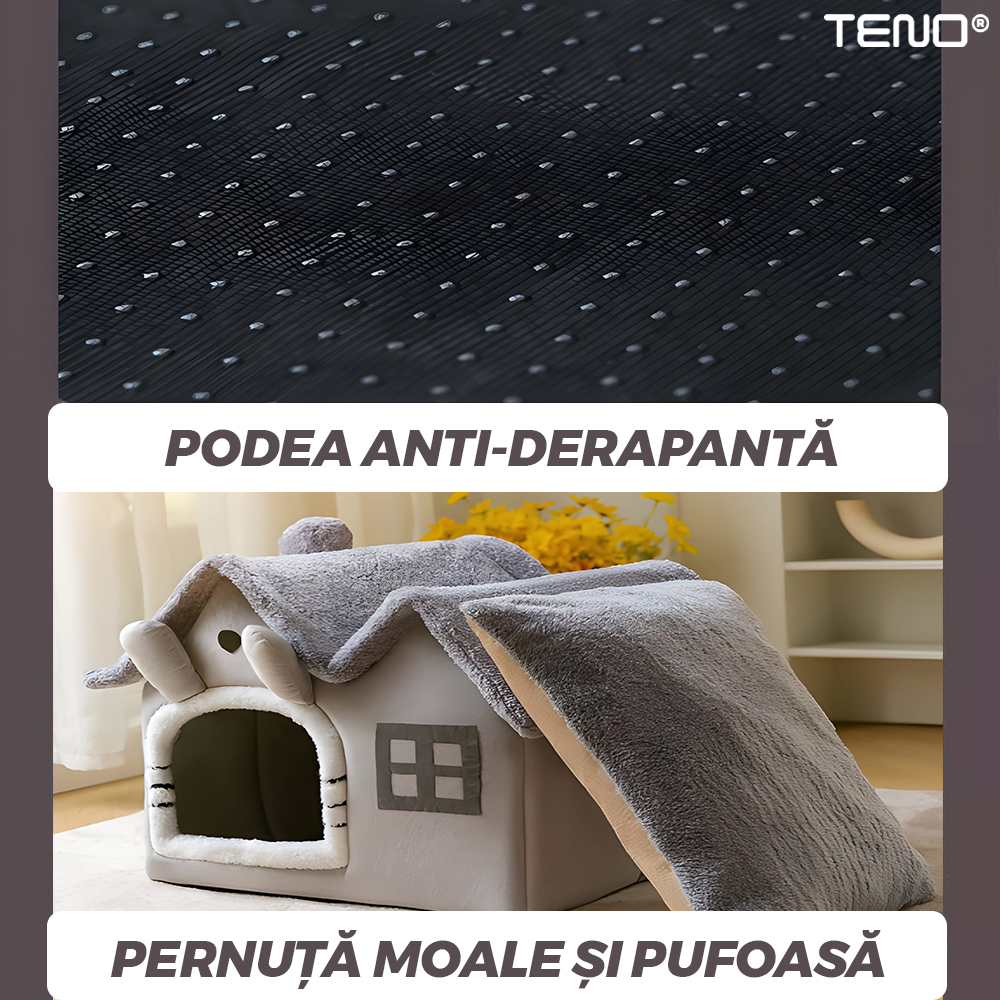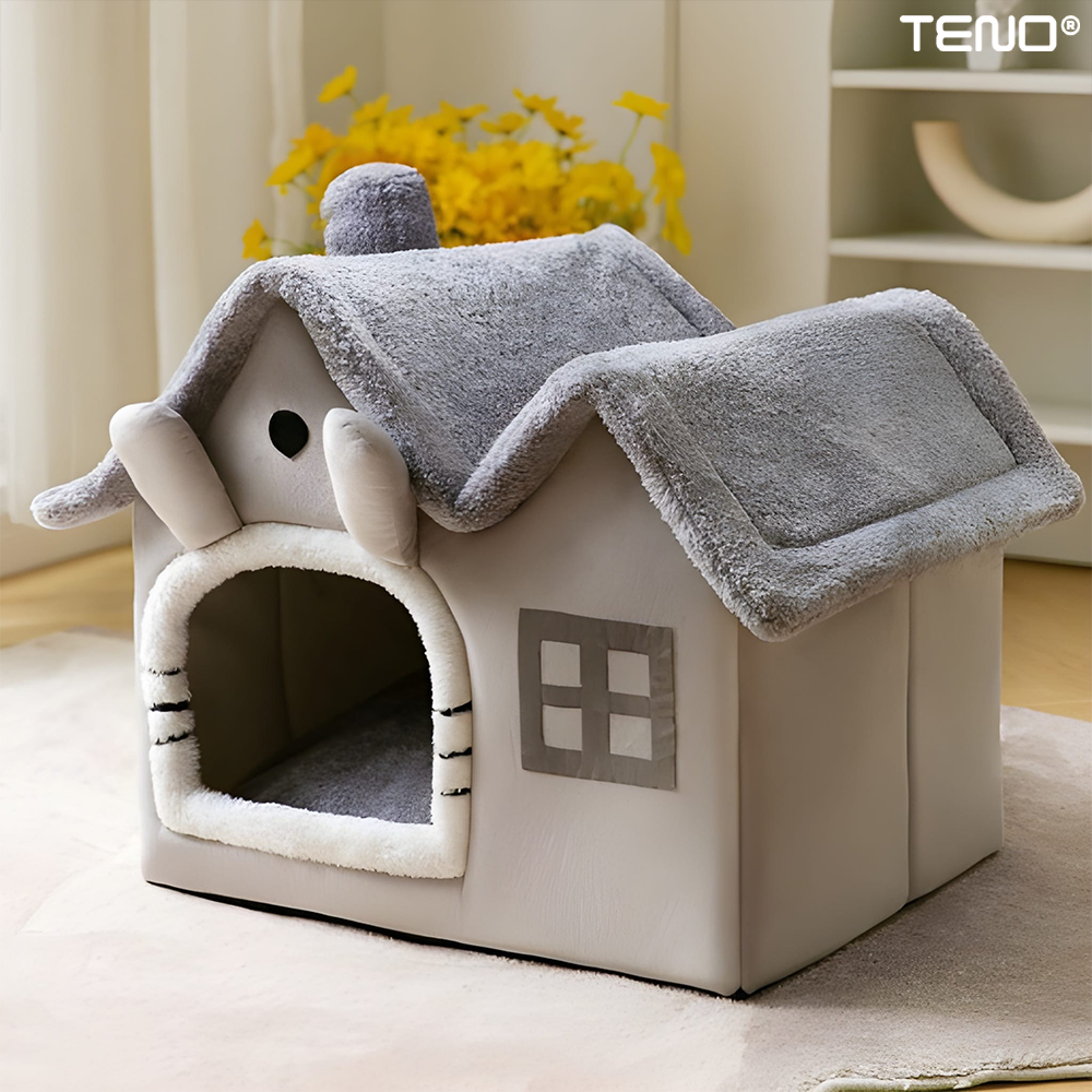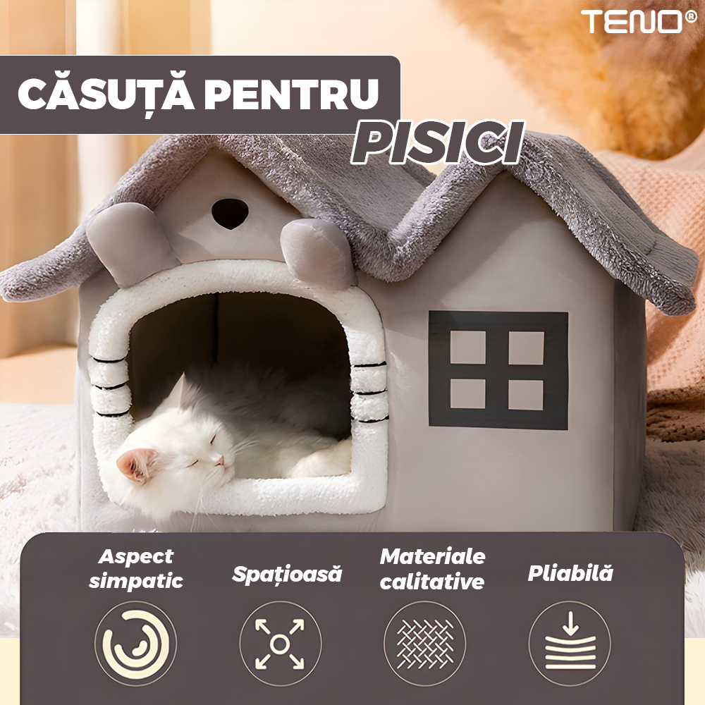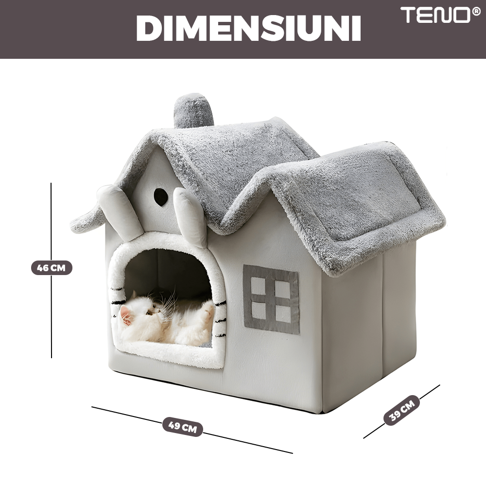 Casuta pentru Pisici Teno1897, de interior, pentru caini/pisici/animale mici, baza anti-alunecare, culcus pufos, pliabila, pernuta inclusa, usor de montat, 49 x 39 x 46 cm, gri
