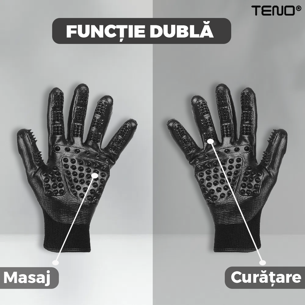 Manusile sunt concepute pentru a oferi animalului tau o experienta placuta de masaj. Suprafata din cauciuc moale a manusii are nastiute sau texturi, care vor stimula pielea animalului si il vor face sa se simta relaxat si confortabil in timpul periajului. Aceasta functie de masaj nu numai ca ii va face pe animale sa se bucure de proces, dar si sa imbunatateasca circulatia sangelui si sa mentina pielea sanatoasa.