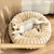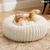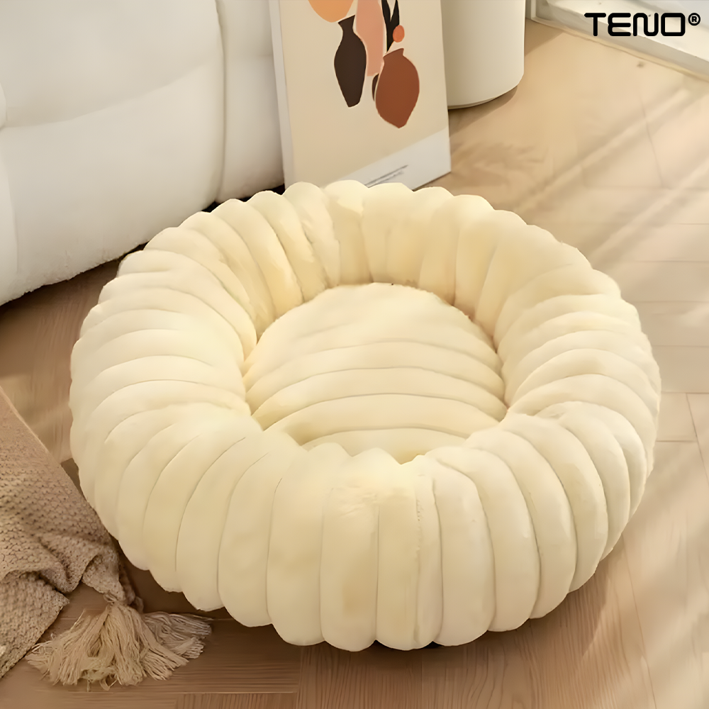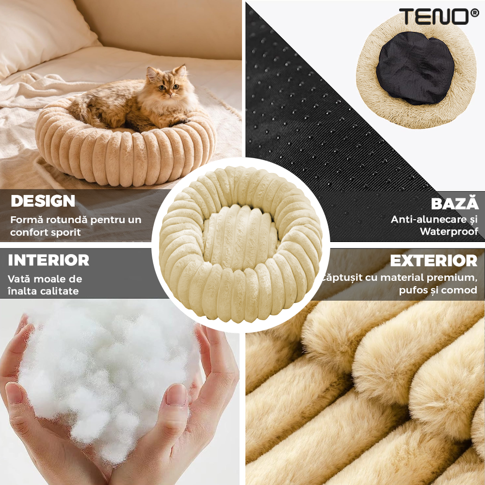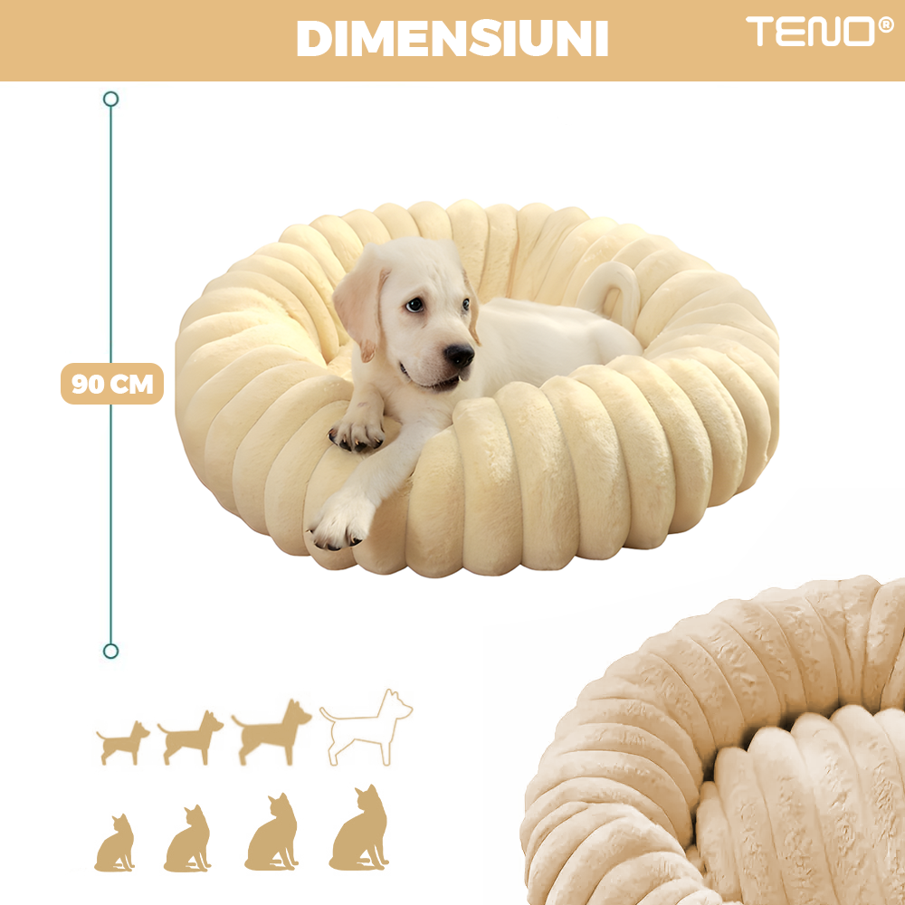 Pat Animale Teno2211, captusit, moale, pufos si calduros, pentru caini si pisici, diametru 90 cm, baza anti-alunecare, design dungat, bej