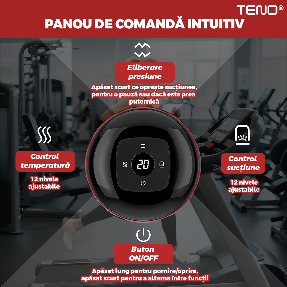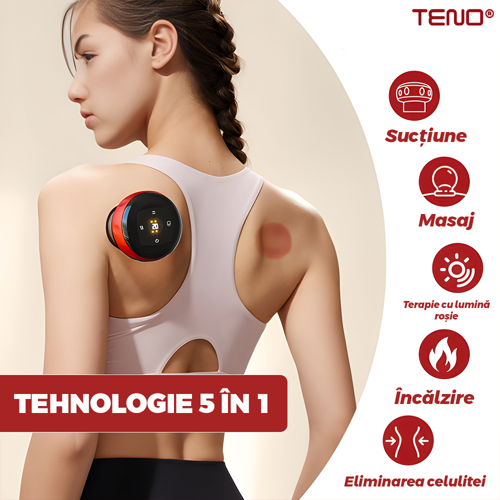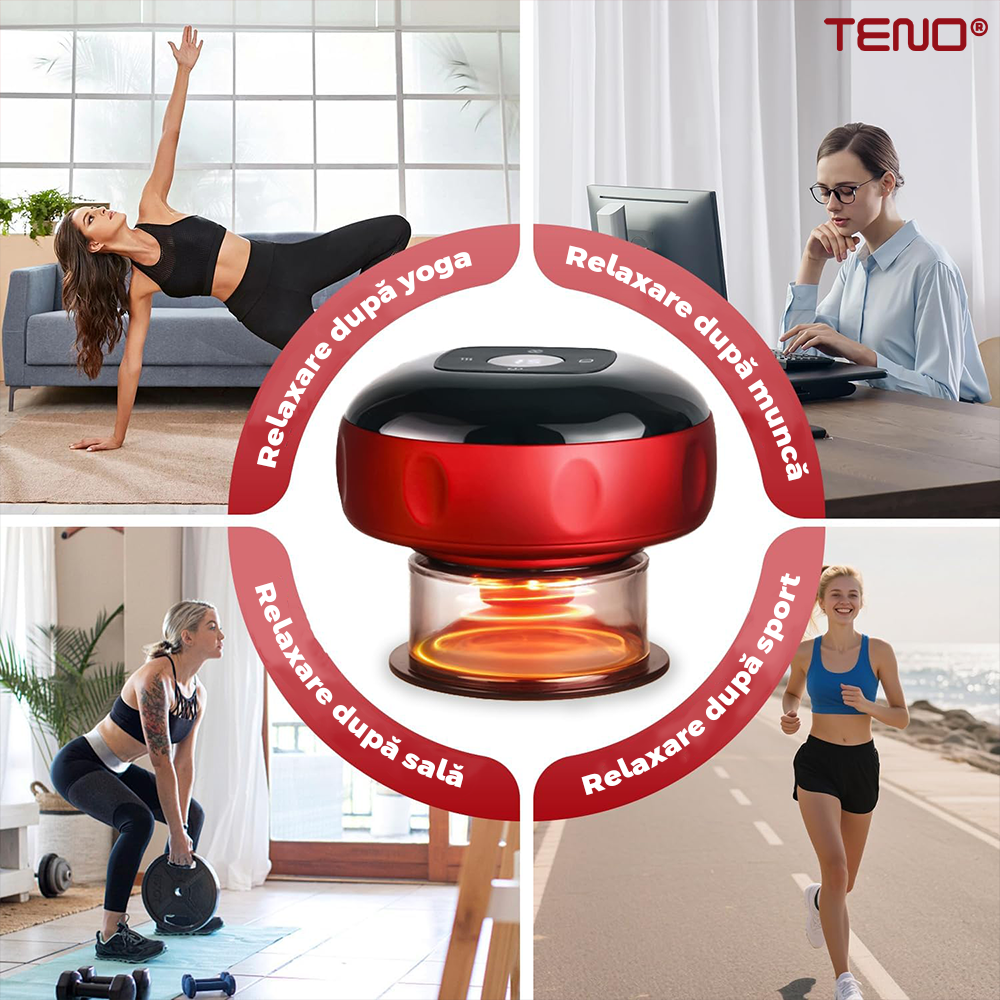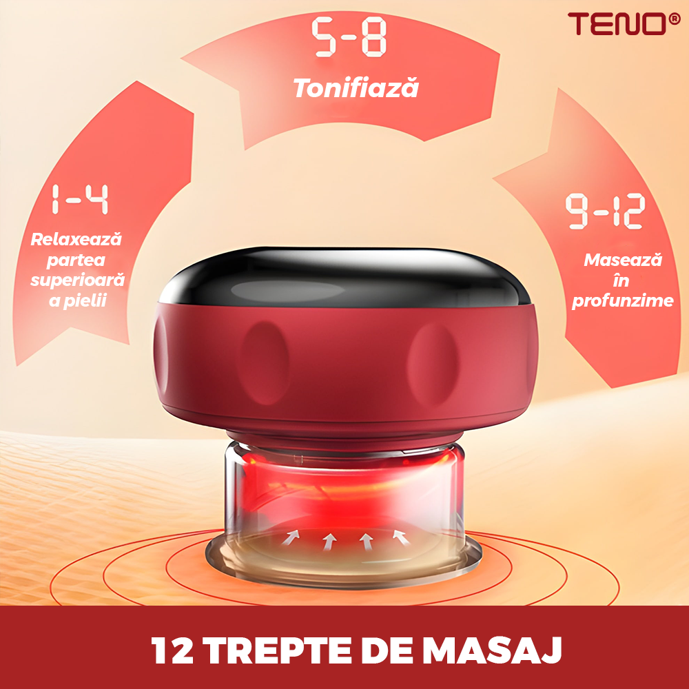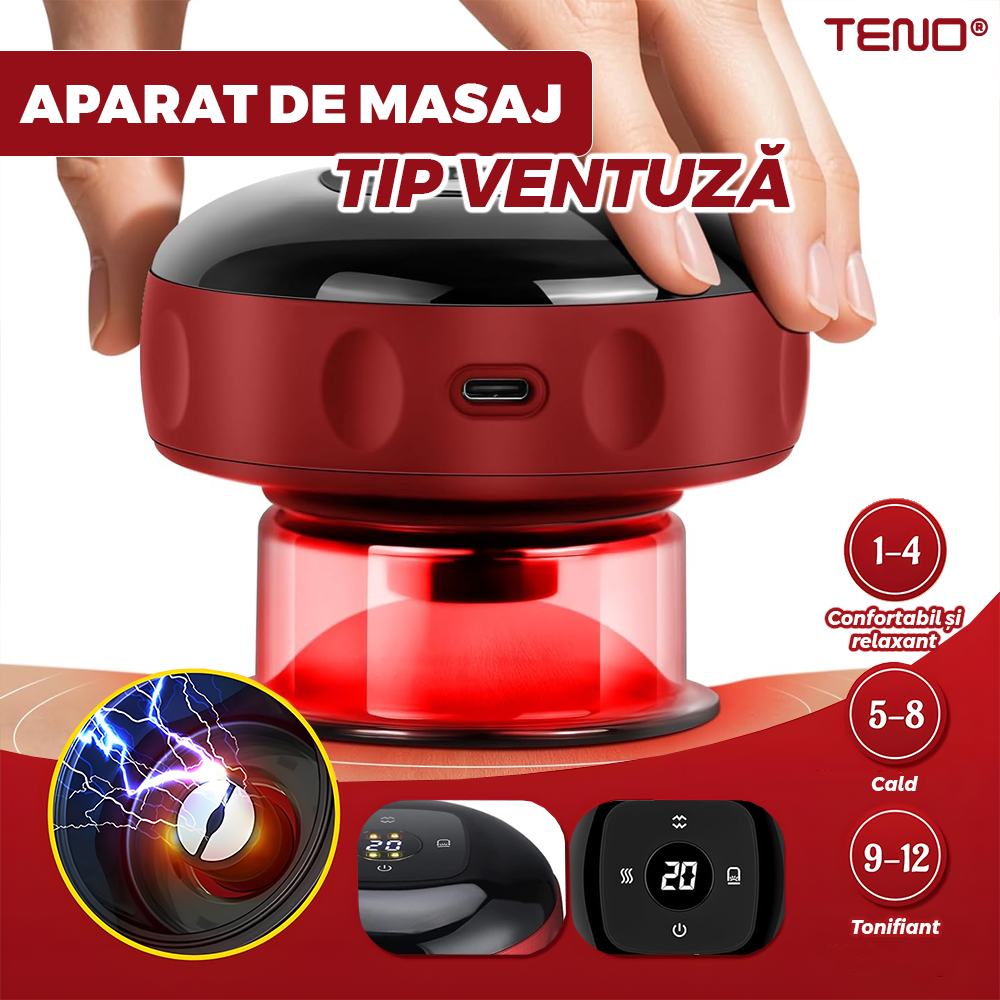 Aparat Electric pentru Masaj Teno2056, tip ventuza, 12 niveluri de incalzire si de presiune, promoveaza circulatia sangelui, pentru masaj/tonifiere/drenaj limfatic,baterie de 1800 mAh, incarcare USB, ulei esential inclus, rosu