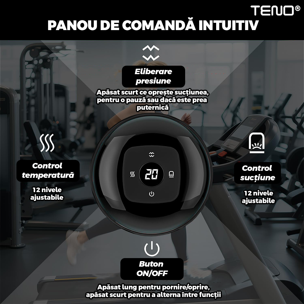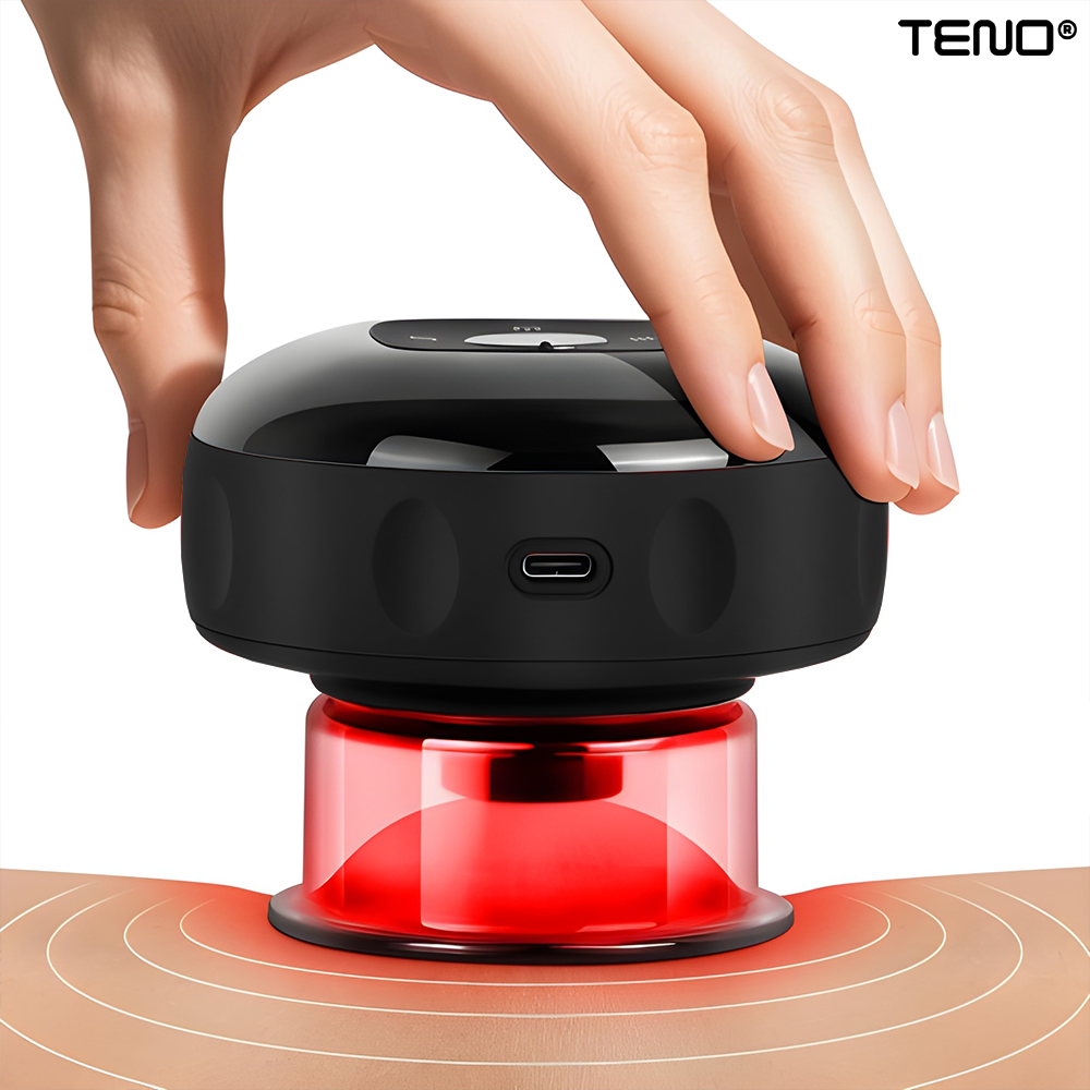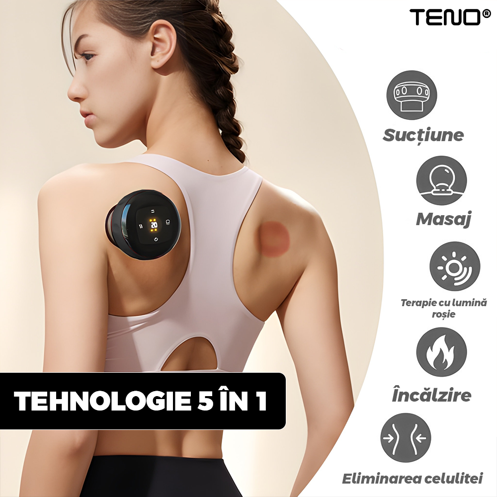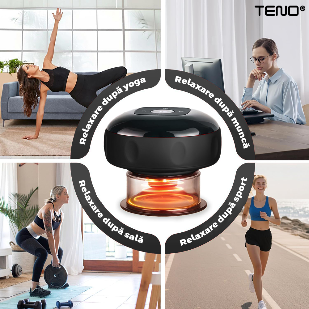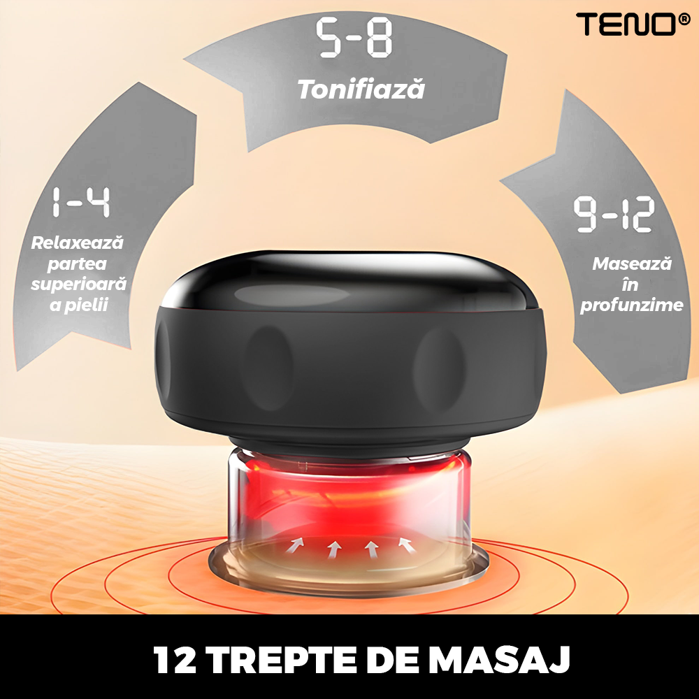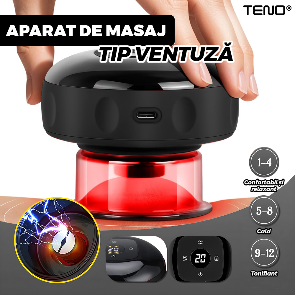 Aparat Electric pentru Masaj Teno2058, tip ventuza, 12 niveluri de incalzire si de presiune, promoveaza circulatia sangelui, pentru masaj/tonifiere/drenaj limfatic,baterie de 1800 mAh, incarcare USB, ulei esential inclus, negru
