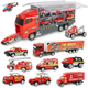 Set Camion Trailer de Jucarie pentru Transport Teno1165, seria utilaje de constructie, 11 masinute incluse, bulldozer, utilaje, tir, accesorii mobile, lansator si rampa frontala, platforma tractare, galben