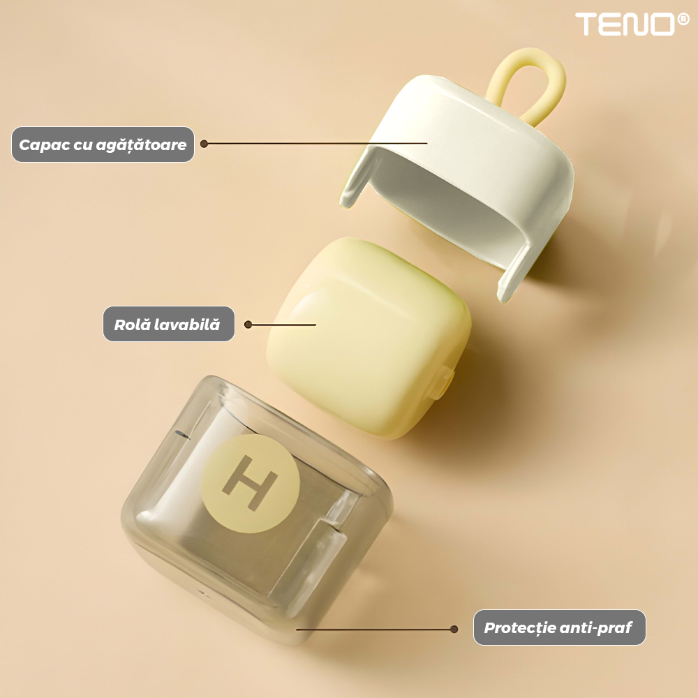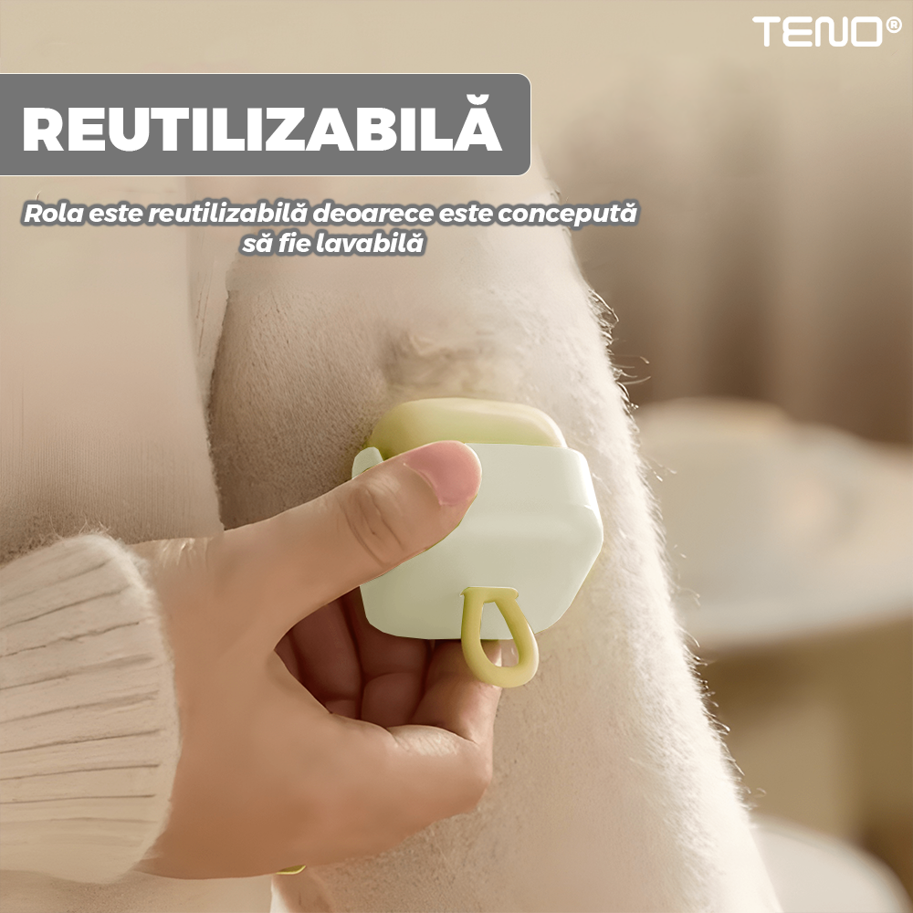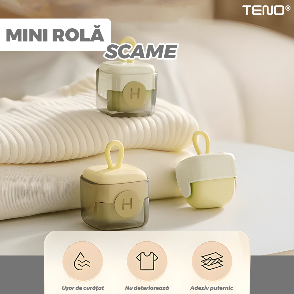 Mini Rola Scame Teno2242, reutilizabila prin spalare, silicon lavabil, indepartare scame/par animale/praf, pentru mobilier/haine, compacta, 4.5 x 4.5 cm, crem/alb