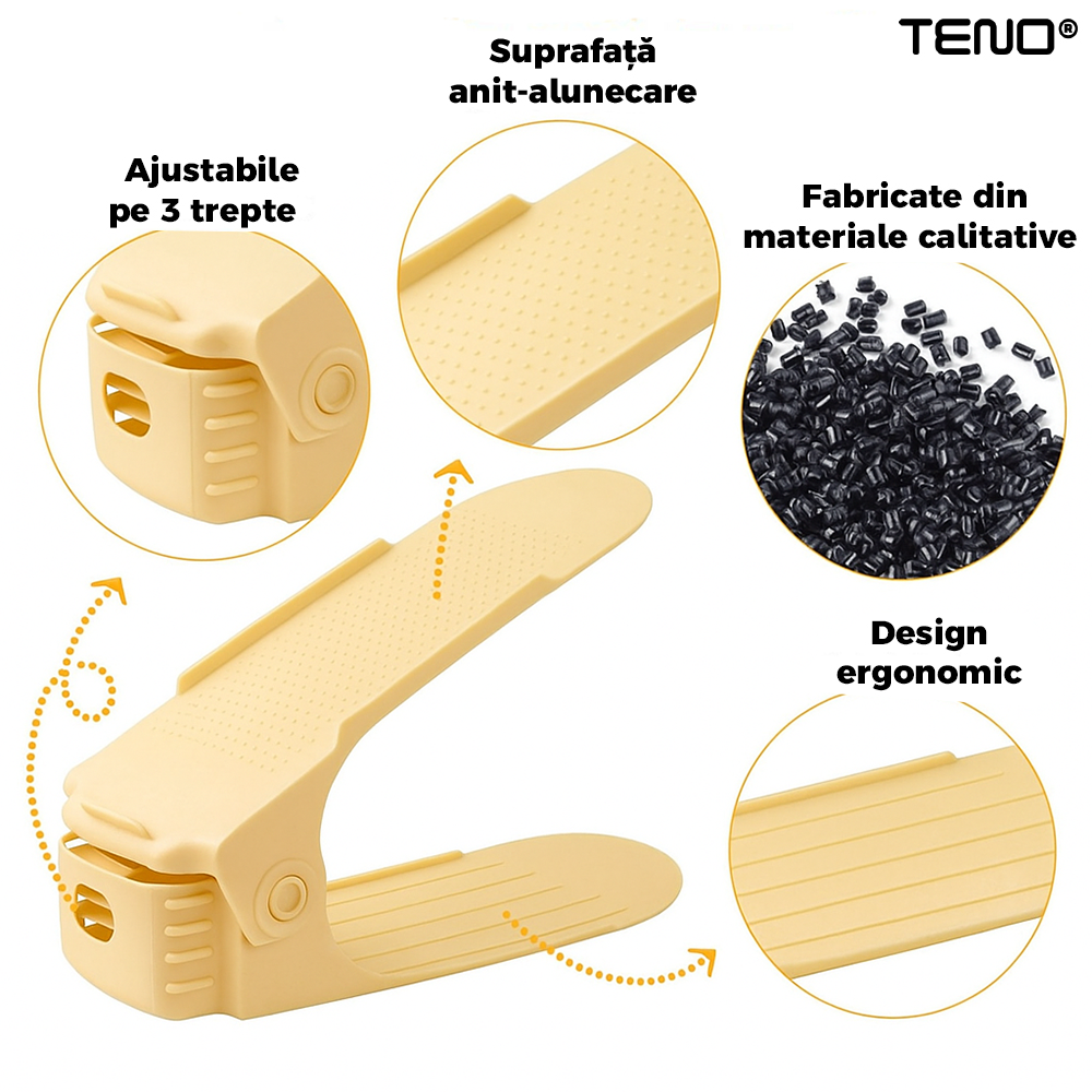 Unul dintre punctele forte ale acestor organizatoare este caracteristica reglabila pe 3 inaltimi. Poti ajusta inaltimea organizatorului pentru a se potrivi cu diferite tipuri de incaltaminte, de la pantofi casual la cei cu toc inalt. Acest lucru nu numai ca optimizeaza utilizarea spatiului, dar si protejeaza forma si structura pantofilor, evitand deformarile nedorite.