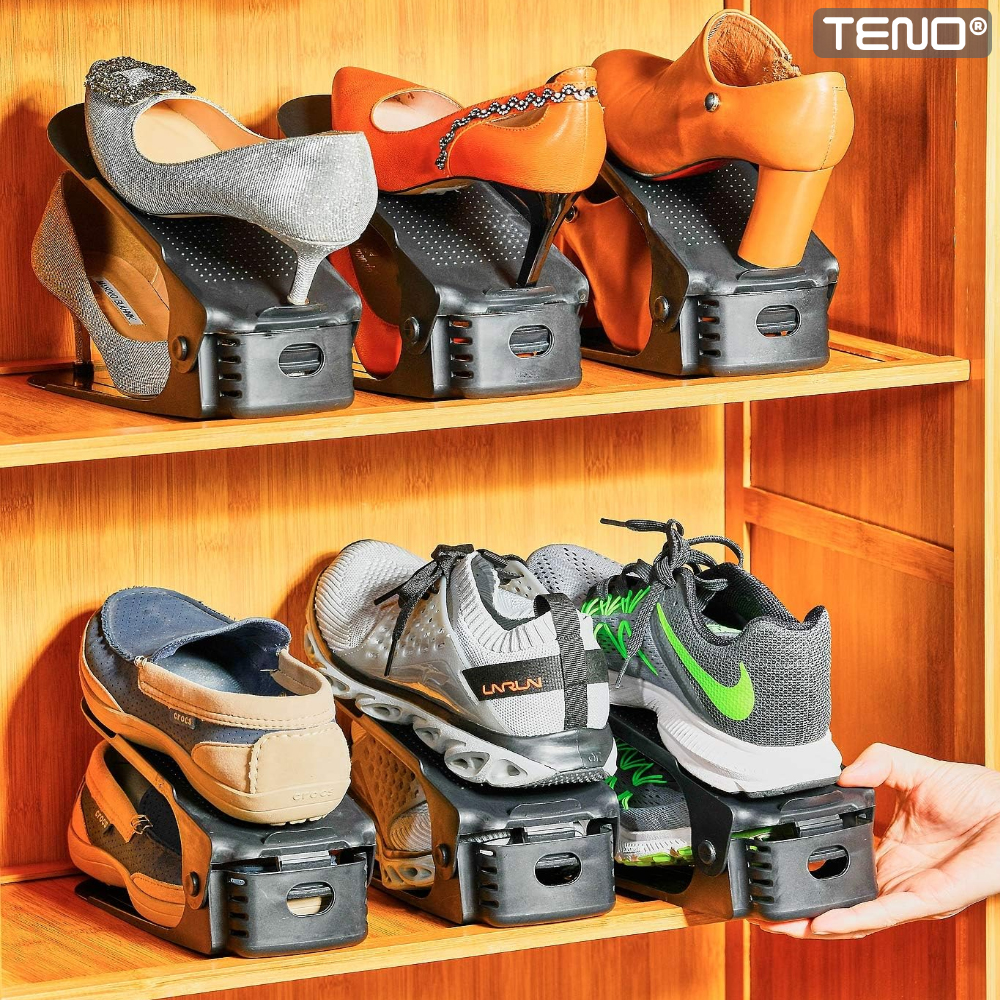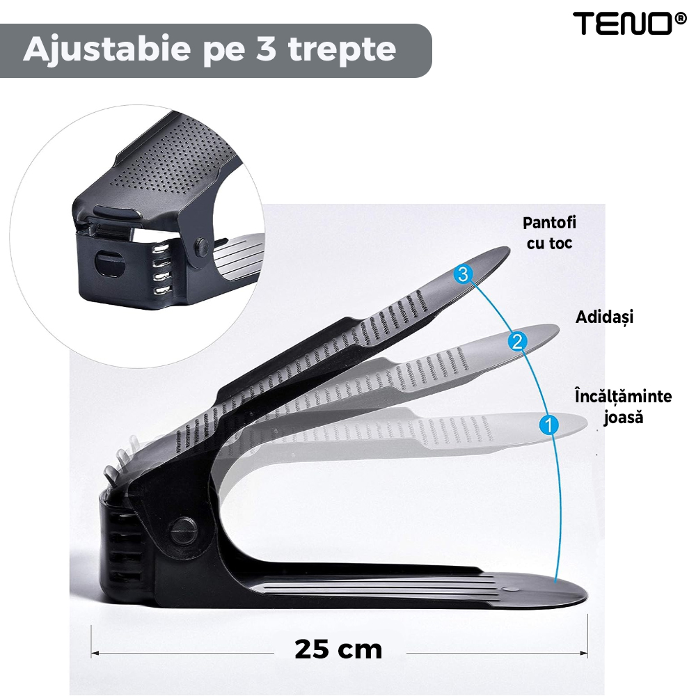 Set 8 Organizatoare Incaltaminte Teno2525, 3 niveluri de reglare pe inaltime, suport, economisire spatiu, materiale calitative, universale, negru