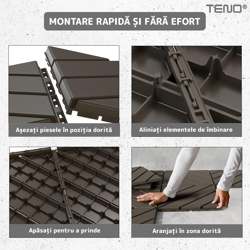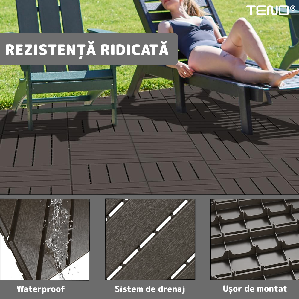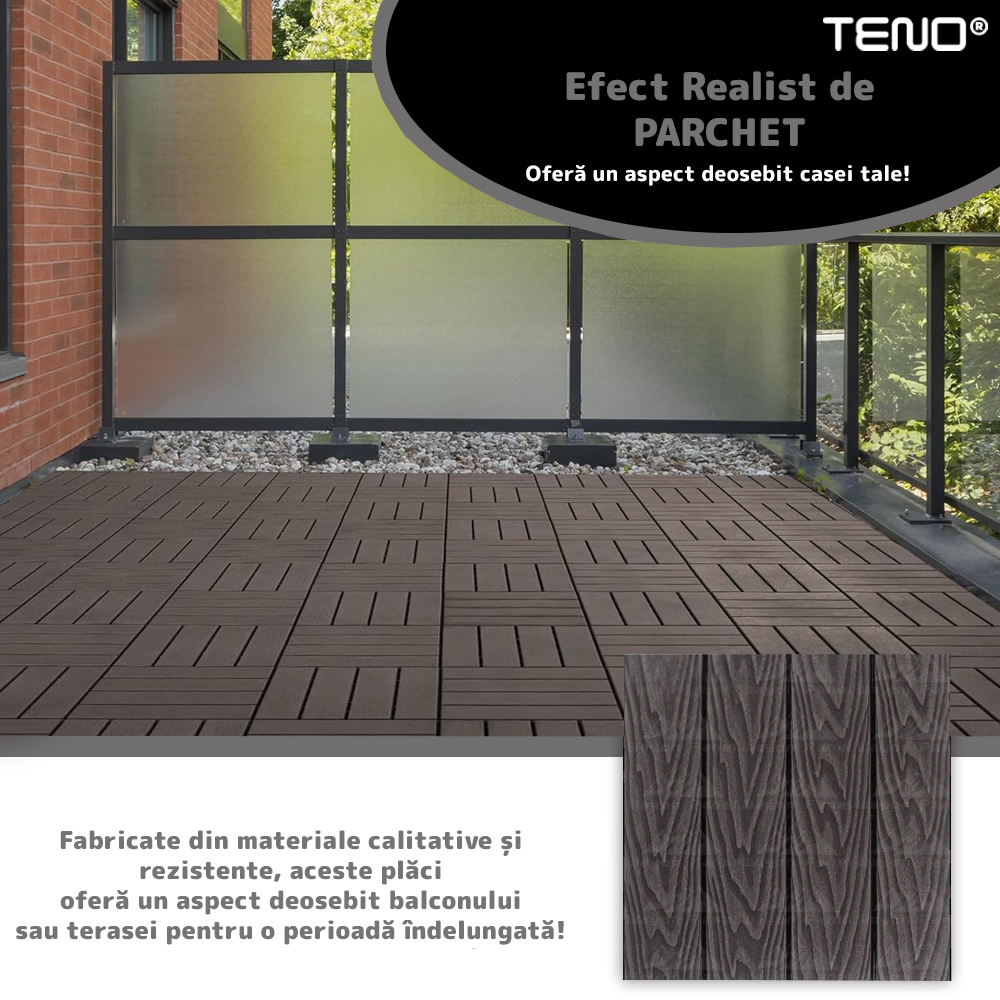 Set 20 Placi pentru Terasa Teno2461, tip mozaic din lemn, durabile, prindere prin imbinare, PVC, 30 x 30 cm, 1.8 m²/box, maro ciocolatiu