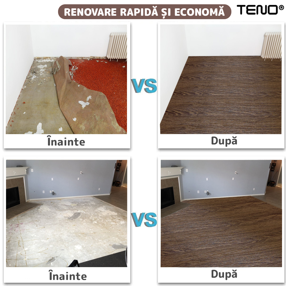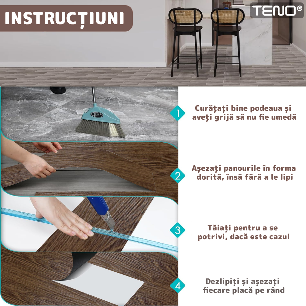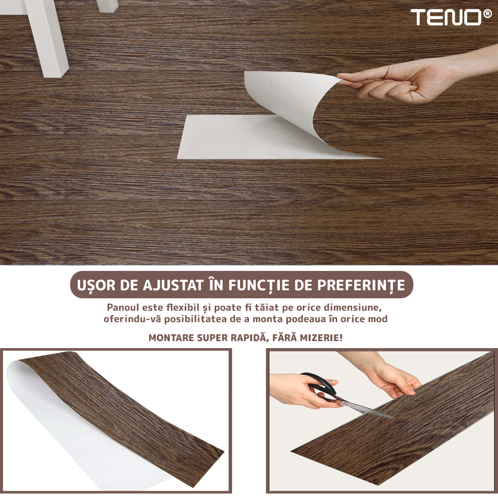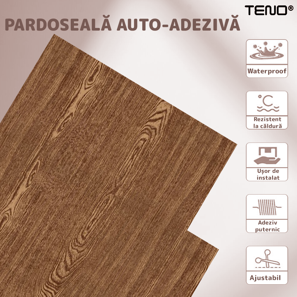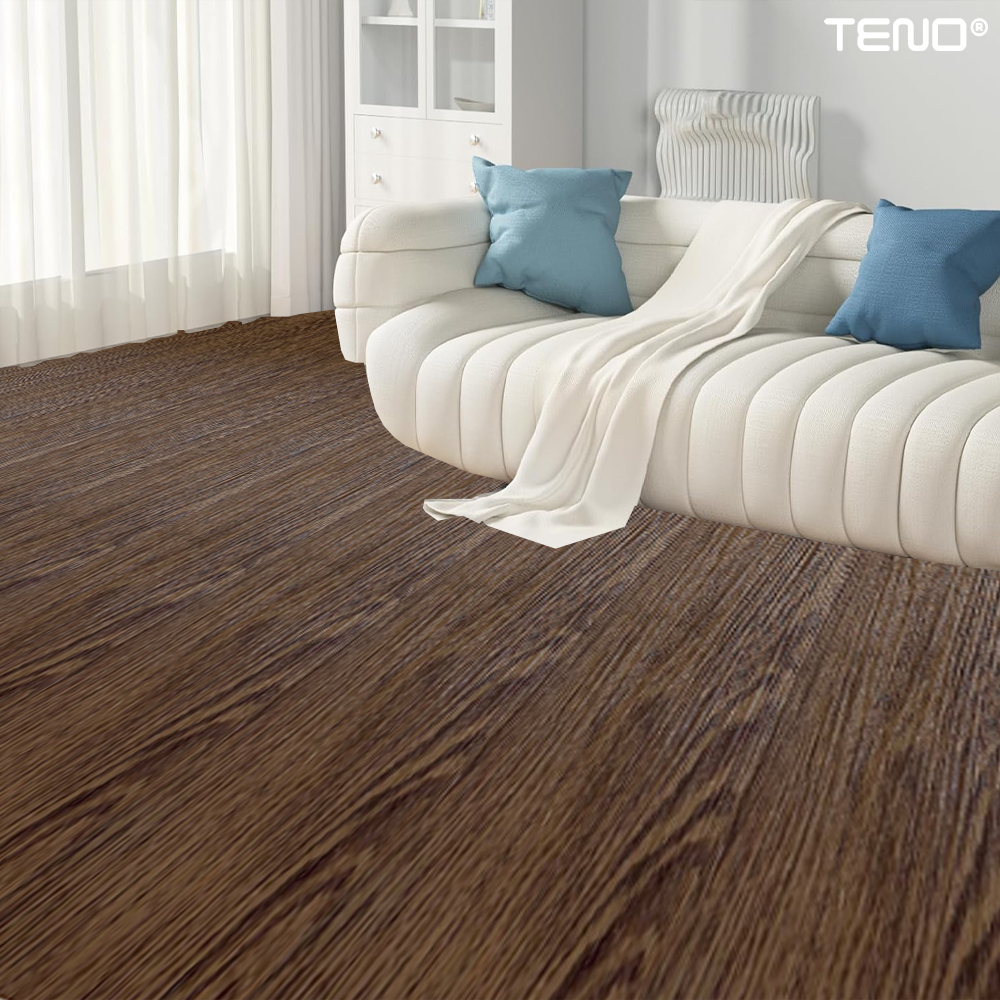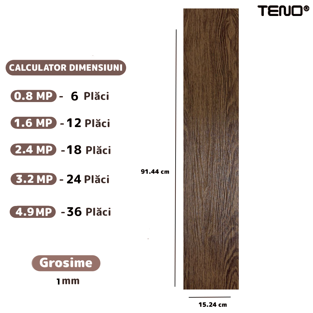 Set 36 Placi de Pardoseala Autoadezive Tip Parchet Teno2465, durabile, adeziv puternic, PVC, 91.44 cm x15.24 cm, 4.9 m²/box, maro pecan