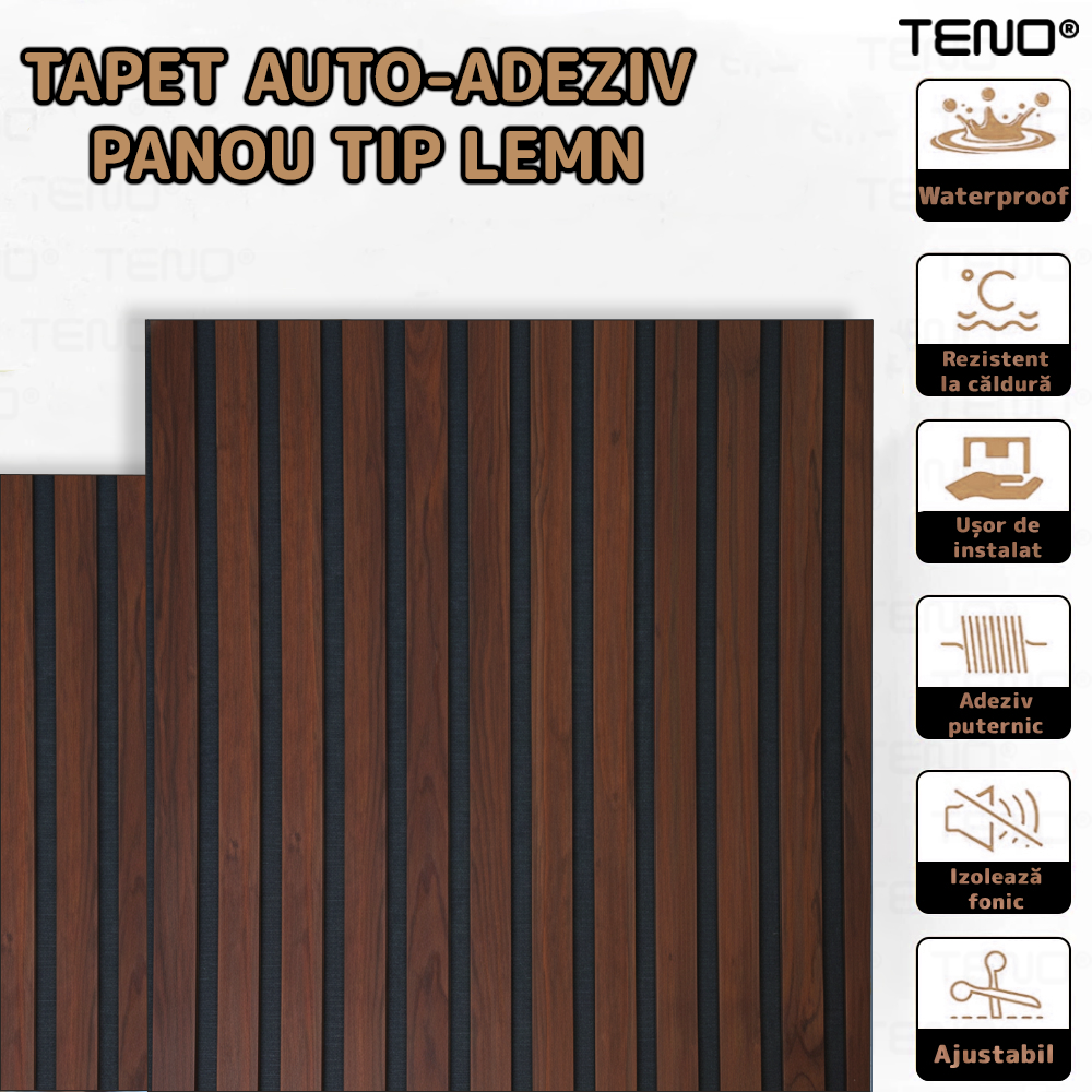 Riflaj 3D Teno2439, panou model lemn, suprafata acoperire 1.74 mp, autoadeziva, waterproof, usor de montat, design modern, 58 cm x 3 m, maro