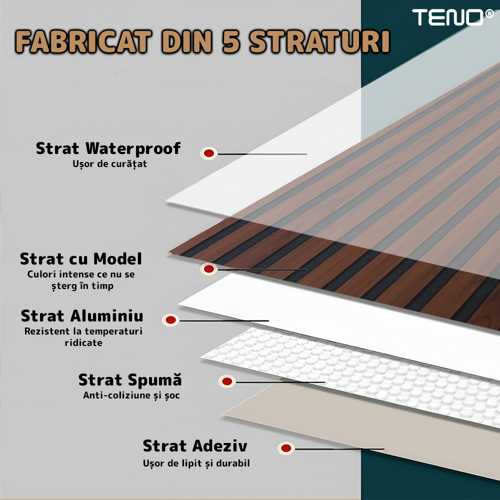 Realizat din 5 straturi, panoul asigura rezistenta sporita, stabilitate si durabilitate in timp, pastrandu-si forma si aspectul chiar si in conditii de utilizare intensa.