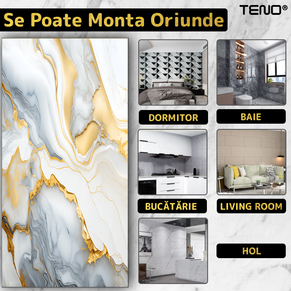 Tapetul este conceput pentru montare rapida si simpla, fara unelte speciale sau experienta anterioara, fiind ideal pentru proiecte DIY si reamenajari rapide.