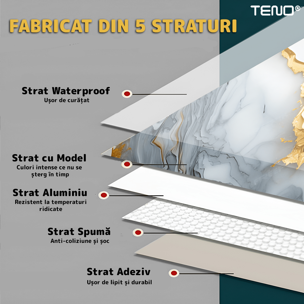 Constructia in 5 straturi asigura durabilitate crescuta, rezistenta in timp si o mai buna stabilitate a materialului, mentinand aspectul impecabil pentru o perioada indelungata.