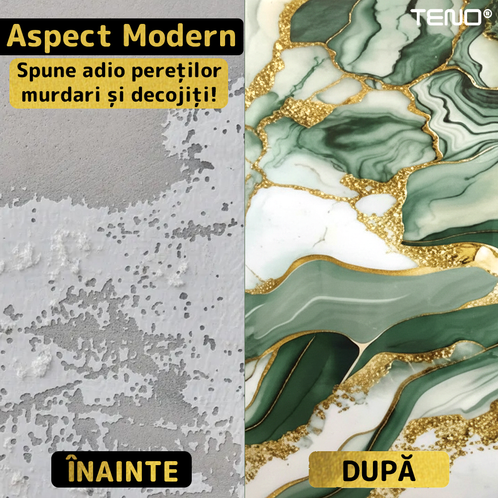 Finisajul cu efect realist de marmura ofera eleganta si profunzime vizuala, imitand fidel textura si venatiile naturale ale pietrei, fara costurile si dificultatile marmurei reale.