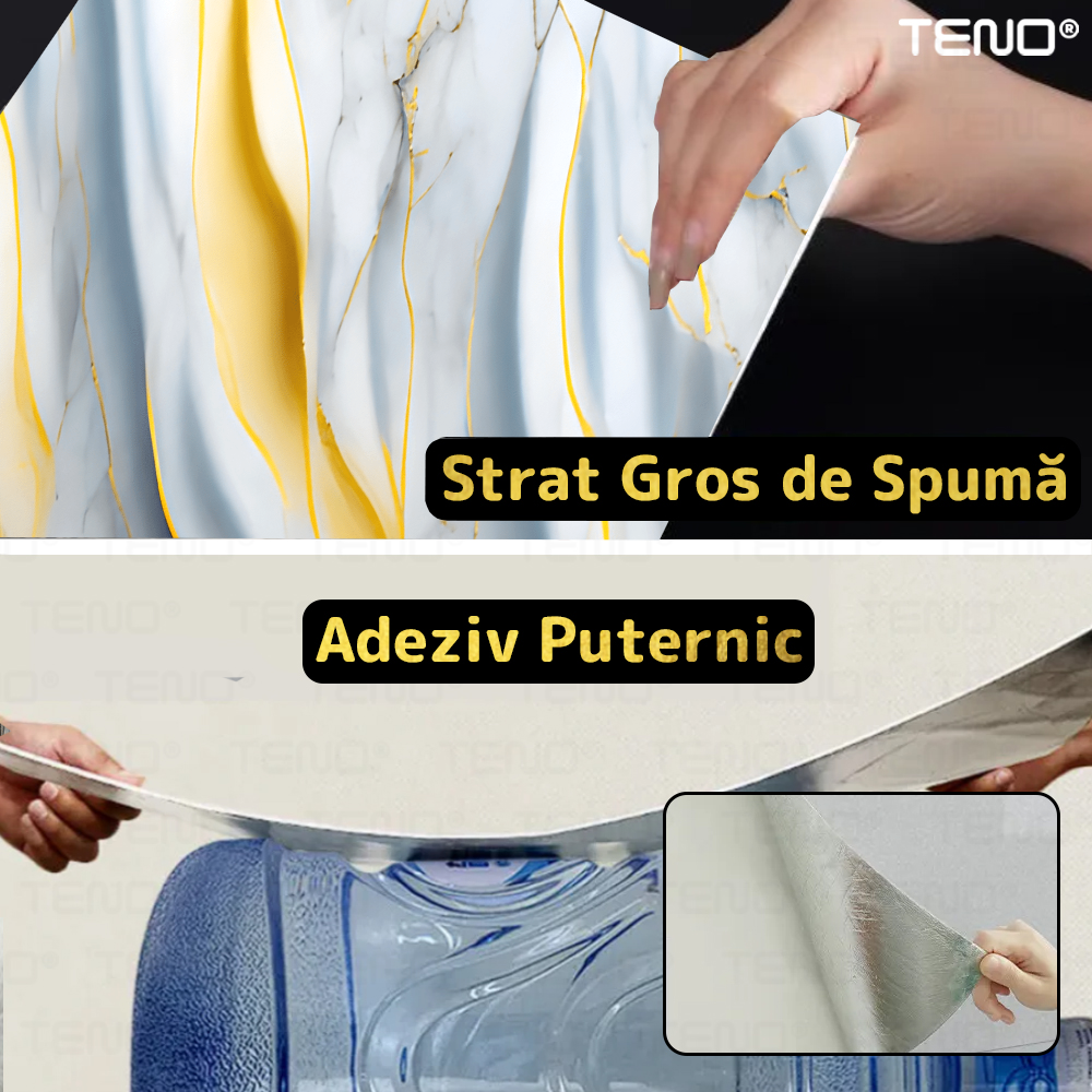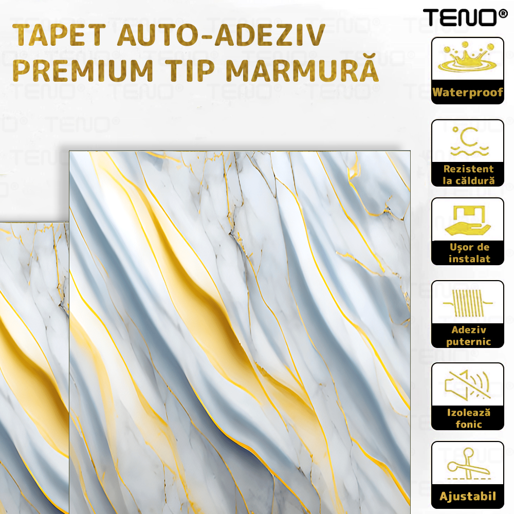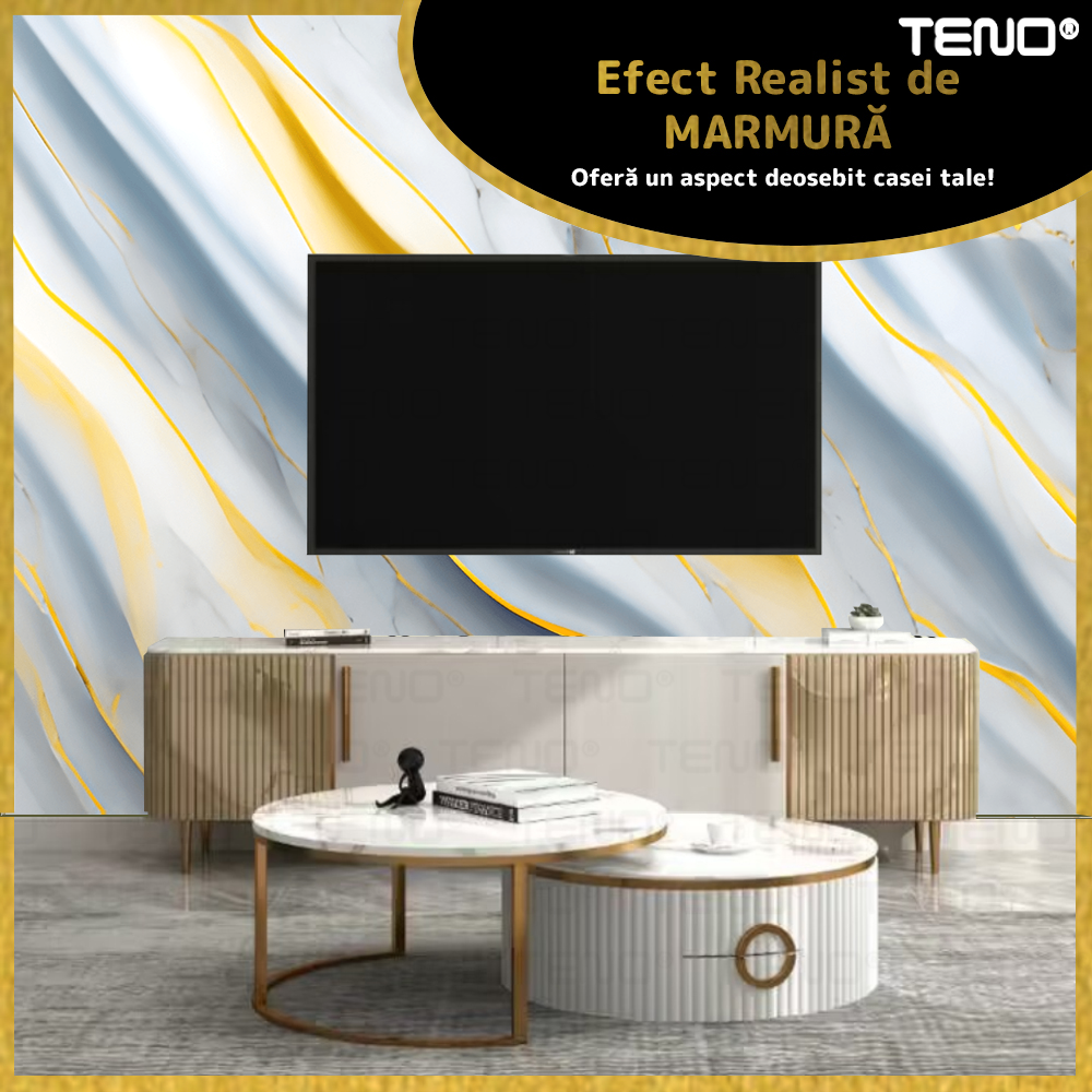Rola Tapet 3D Teno2426, model marmura, suprafata acoperire 3.6 mp, autoadeziva, waterproof, usor de montat, design modern, 3 x 1.2 m, albastru/auriu