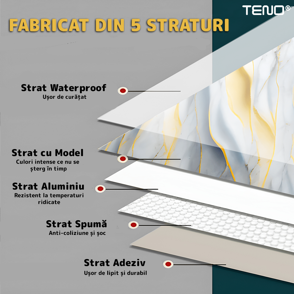 Constructia in 5 straturi asigura durabilitate crescuta, rezistenta in timp si o mai buna stabilitate a materialului, mentinand aspectul impecabil pentru o perioada indelungata.