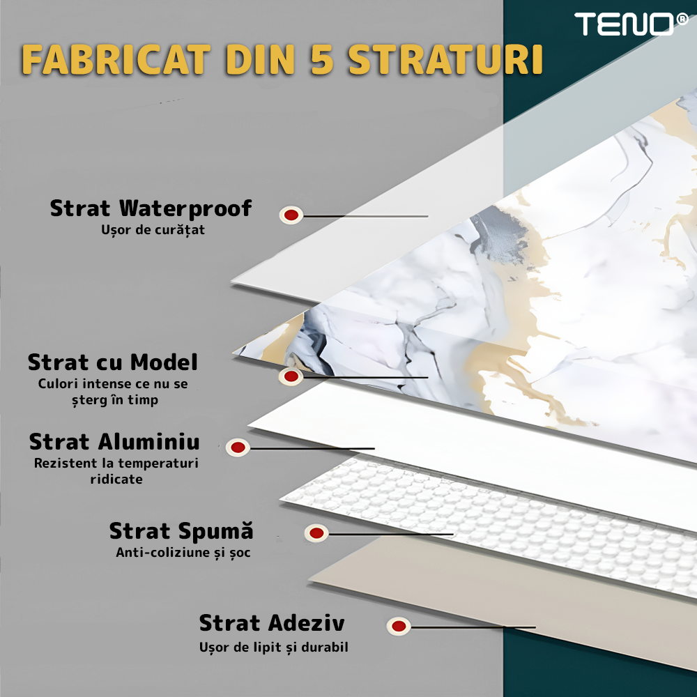 Constructia in 5 straturi asigura durabilitate crescuta, rezistenta in timp si o mai buna stabilitate a materialului, mentinand aspectul impecabil pentru o perioada indelungata.