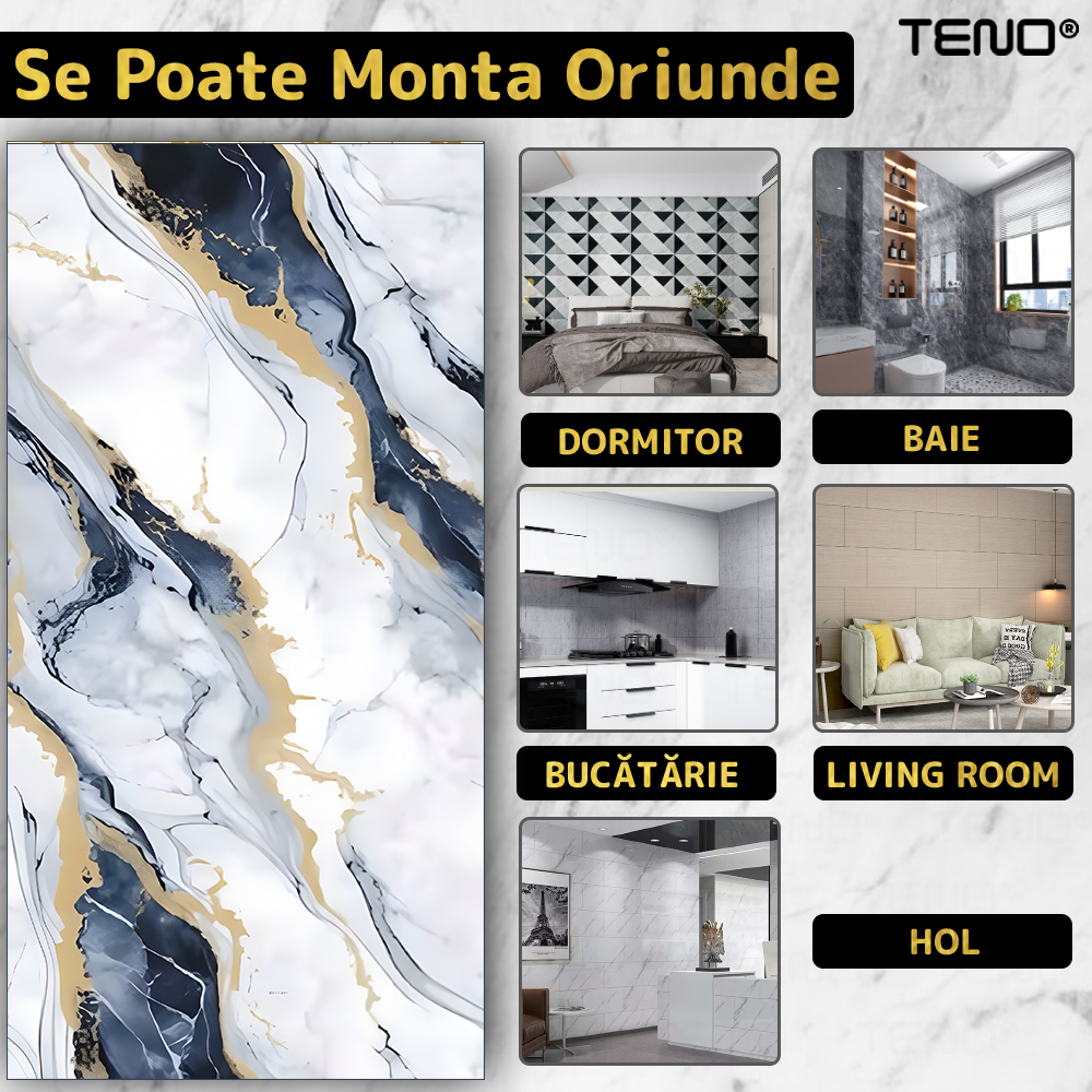 Tapetul este conceput pentru montare rapida si simpla, fara unelte speciale sau experienta anterioara, fiind ideal pentru proiecte DIY si reamenajari rapide.