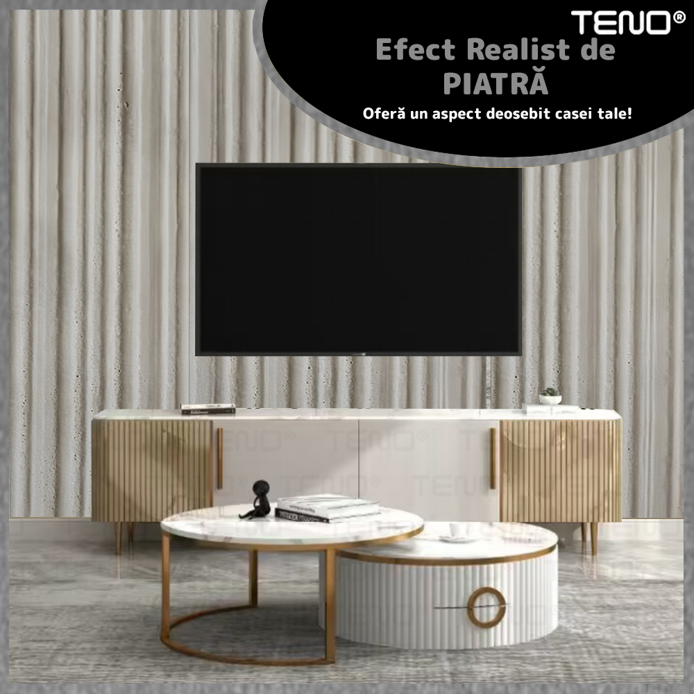 Finisajul cu efect realist de piatra ofera un aspect natural si elegant, reproducand fidel textura si detaliile specifice pietrei, pentru un decor modern si sofisticat, fara costurile si dificultatile materialelor naturale.