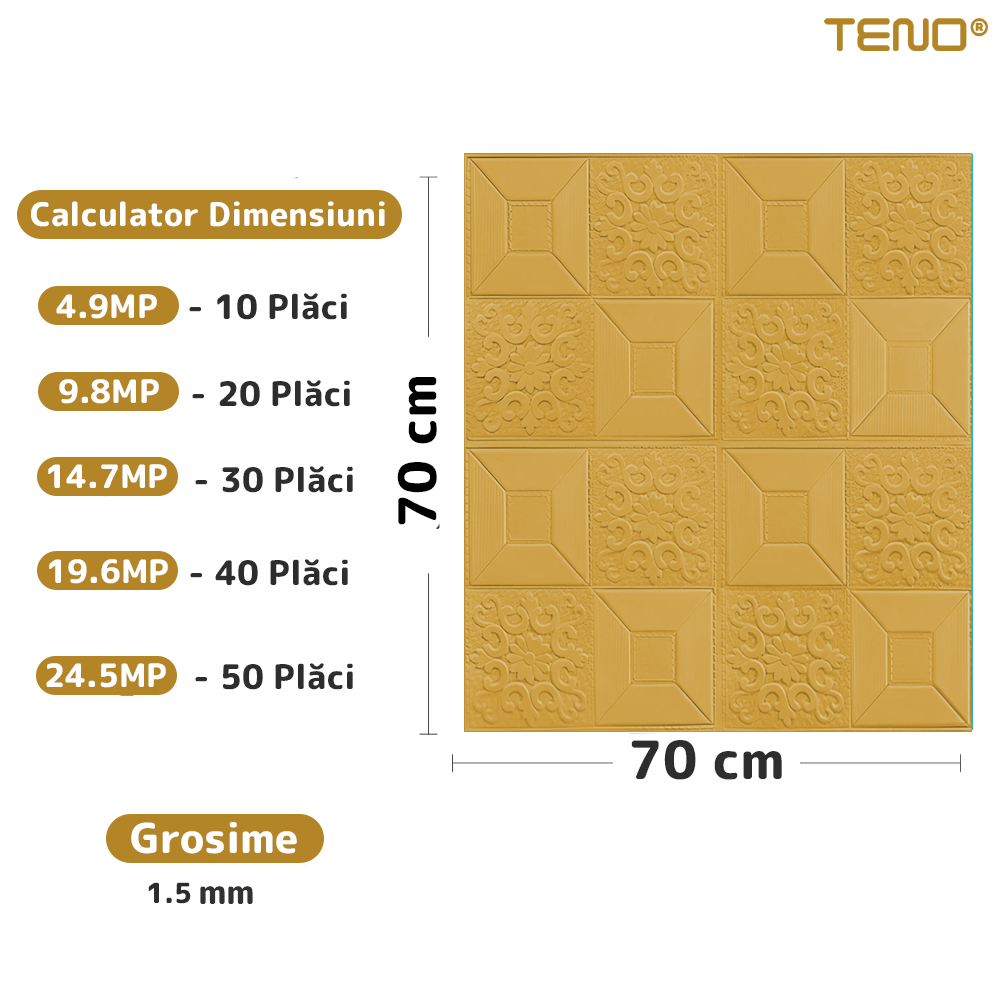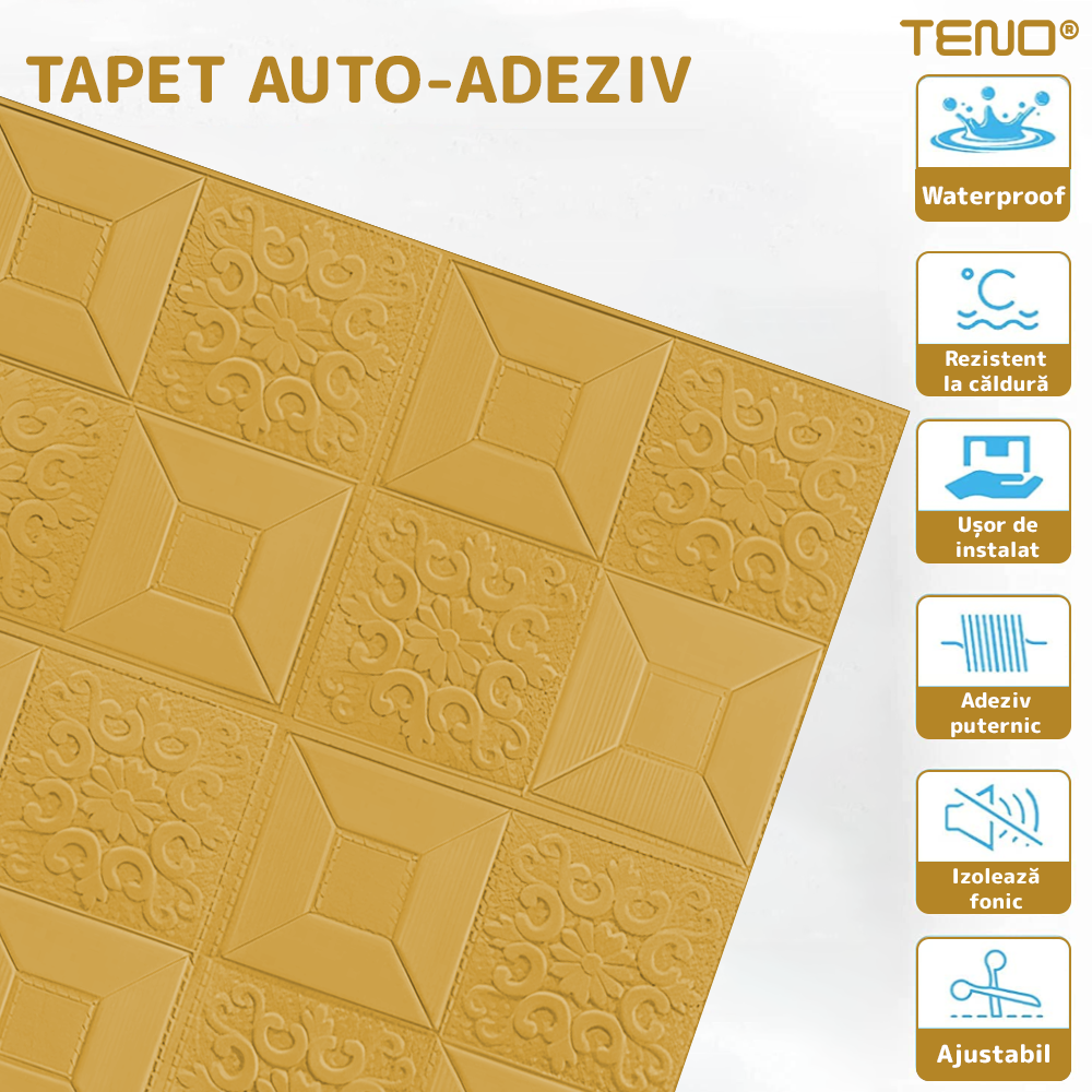 Set 10x Tapet 3D Teno2418, suprafata acoperire 4.9 mp, autoadeziv, perete/tavan, waterproof, usor de montat, design modern, 70x70 cm, galben/auriu