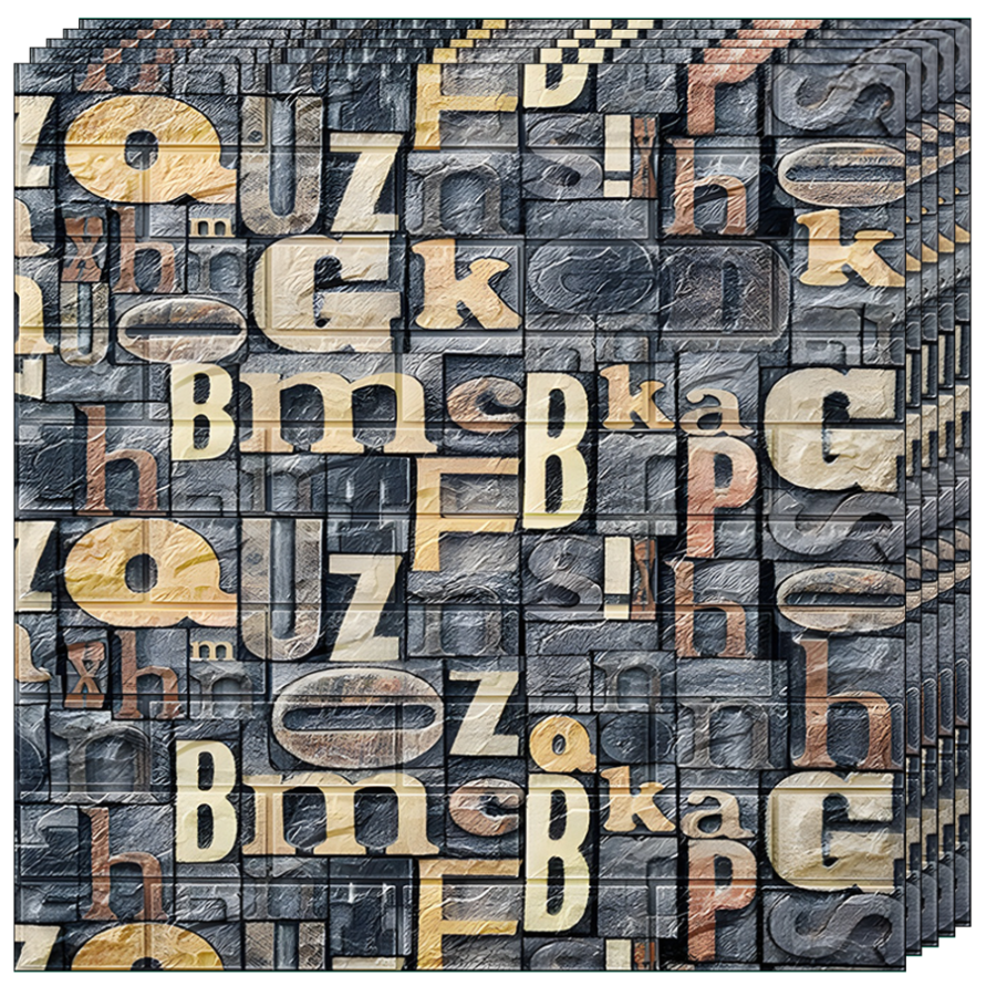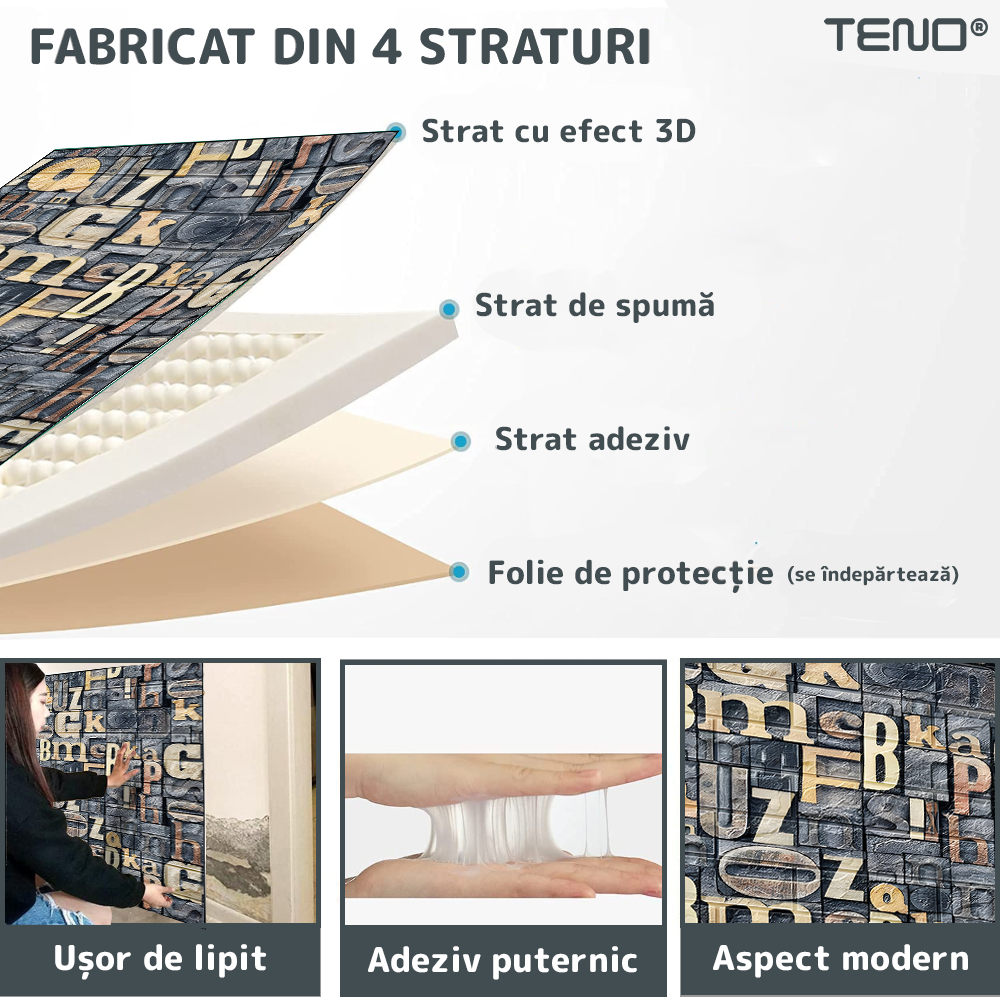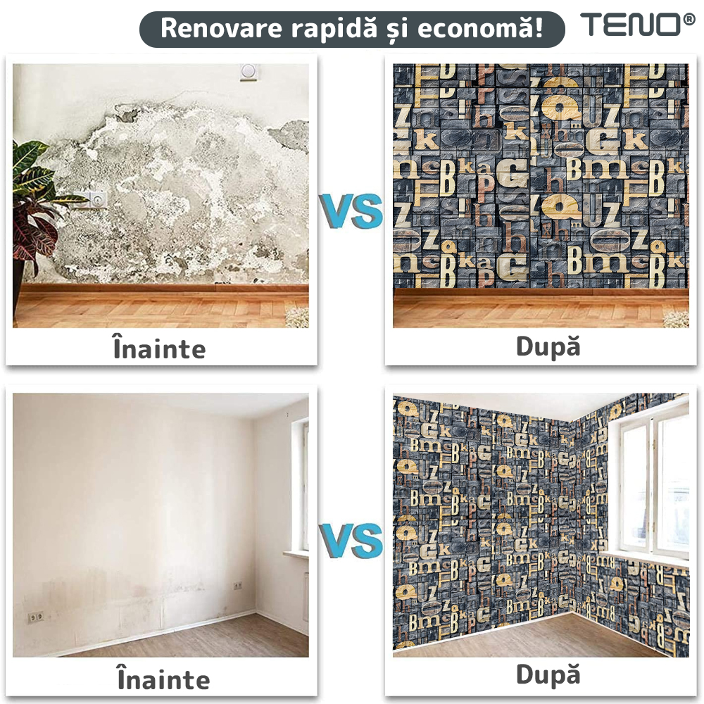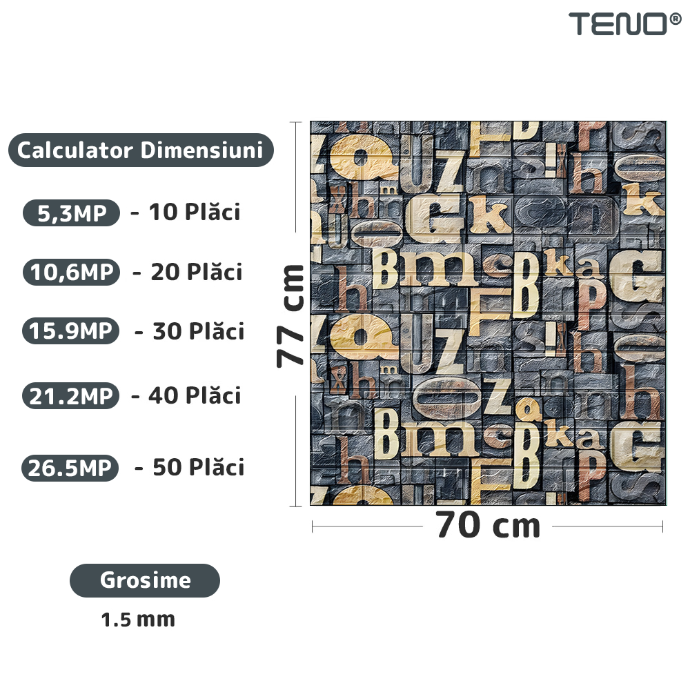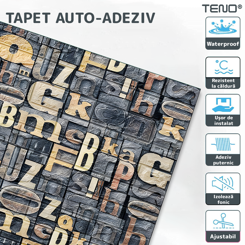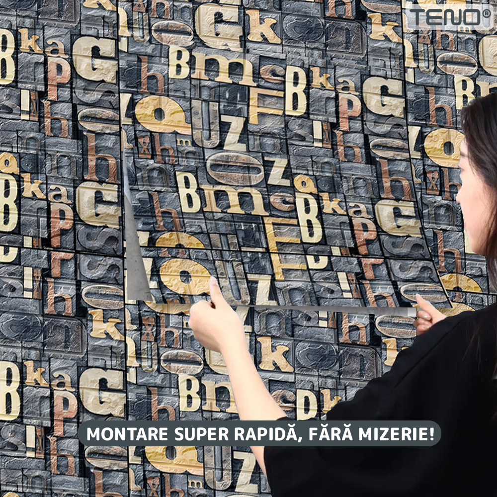 Set 10x Tapet Caramida 3D Teno1914, Model Litere suprafata acoperire 5.3 mp, autoadeziv, waterproof, usor de montat, design modern, 70x77 cm, multicolor