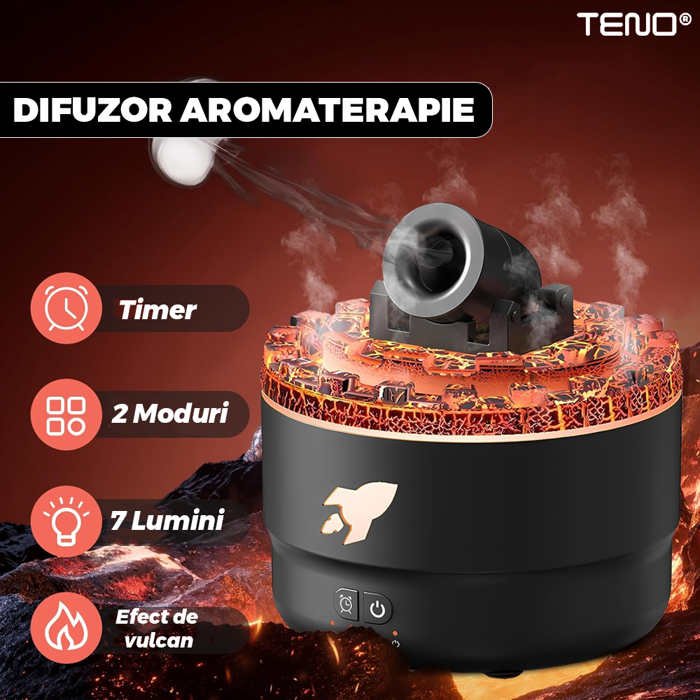 Difuzor Aromaterapie Teno2148, forma de tun, 7 culori LED, lumini dinamice, control tactil, capacitate 300ml, silentios, rezerva inclusa, umidifica aerul, negru