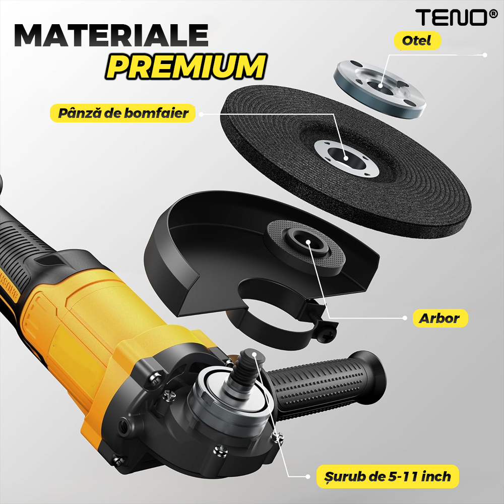 Polizor Unghiular Fără Fir Teno2219, 3 viteze, 1000 RPM, acumulator inclus, alimentare la retea, motor fara perii, protectie supraincalzire, negru/galben