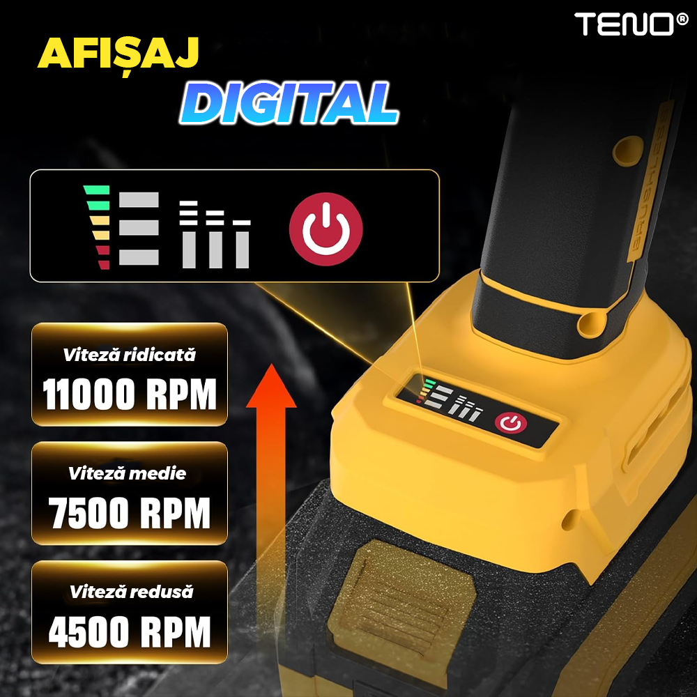Polizorul este dotat cu afisaj digital modern, care permite monitorizarea usoara a nivelului de incarcare, a setarilor de viteza si a statusului de functionare, oferind astfel un control precis si intuitiv.