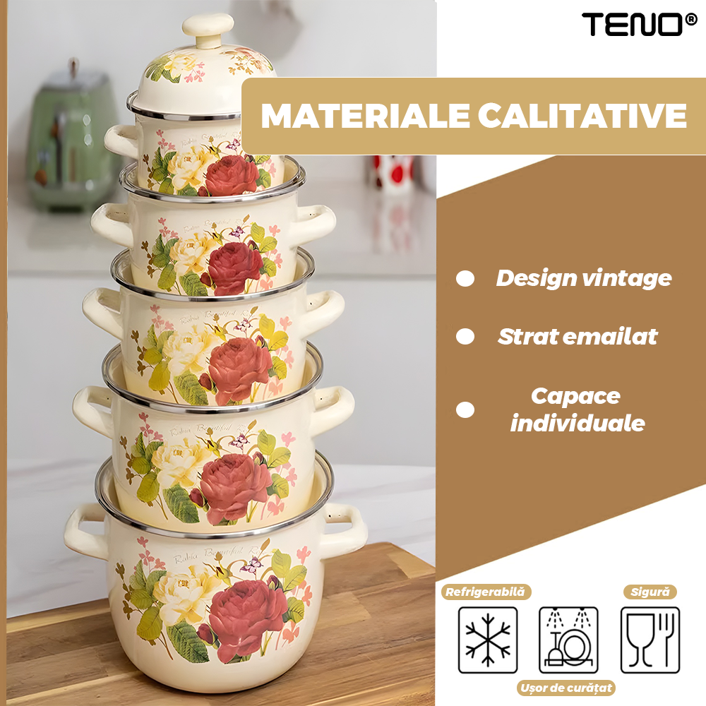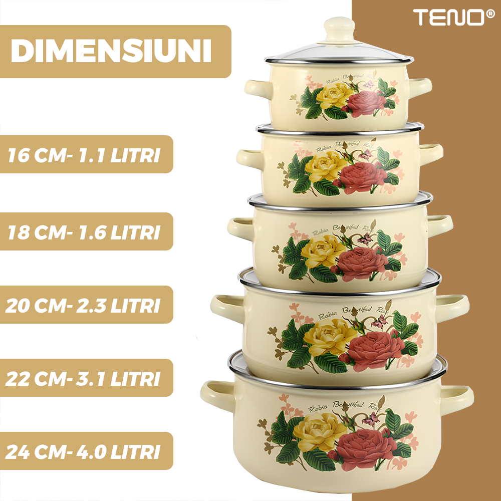 Set 5 Oale Emailate Teno2062, capace incluse, rezistente, pentru fiert/copt/prajit, 5 dimensiuni, capacitate 1-4 l, 16/18/20/22/24 cm, crem