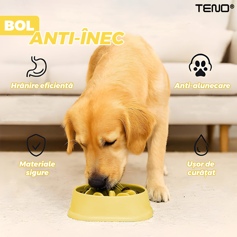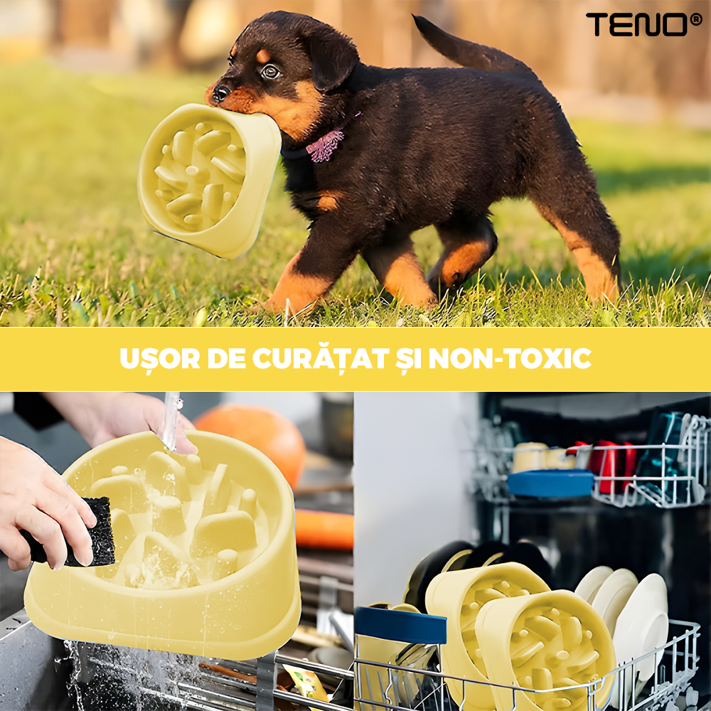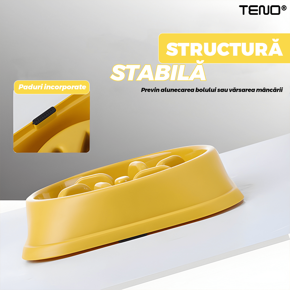 Alimentator Lent pentru Animale Teno2226, anti-alunecare, rezistent la cadere, indentatii interioare, imbunatateste digestia, materiale sigure, galben