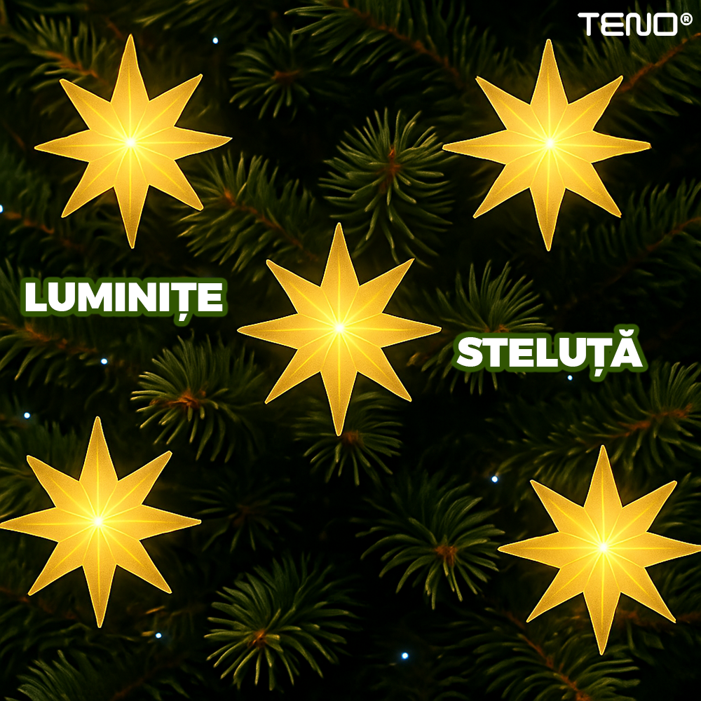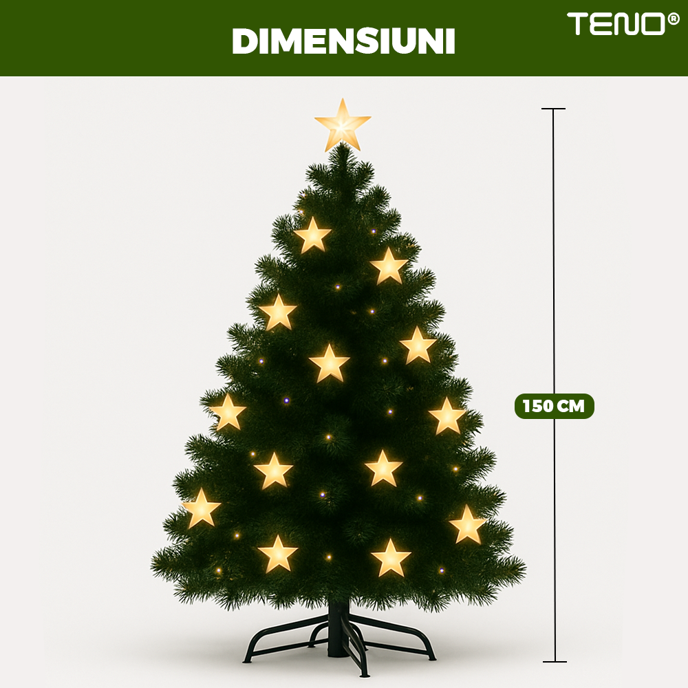 Brad Artificial de Craciun Teno2529, luminite in forma de stea, varf stea inclus, cadru metalic, atmosfera feerica, verde, 150 cm