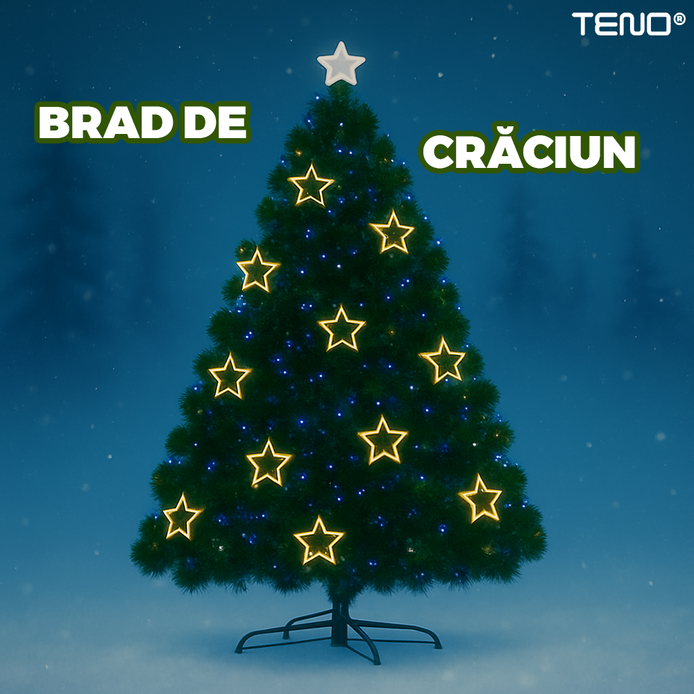 Bradul este decorat cu luminite delicate in forma de stea, care stralucesc discret si creeaza un efect feeric. Jocul de lumini aduce un plus de farmec si face ca fiecare seara sa devina speciala, perfecta pentru momente de bucurie alaturi de cei dragi.