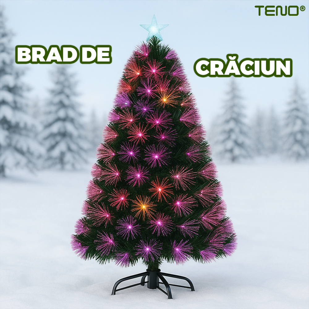 Bradul este decorat cu luminite tip fibra optica, care difuzeaza culori delicate si creeaza un efect spectaculos, modern si elegant. Jocul de lumini se schimba subtil, oferind un spectacol vizual feeric ce completeaza perfect magia Craciunului.