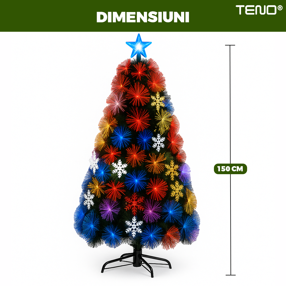 Brad Artificial de Craciun Teno2538, luminite multicolore tip fibra optica, varf stea inclus, cadru metalic, atmosfera feerica, verde, 150 cm