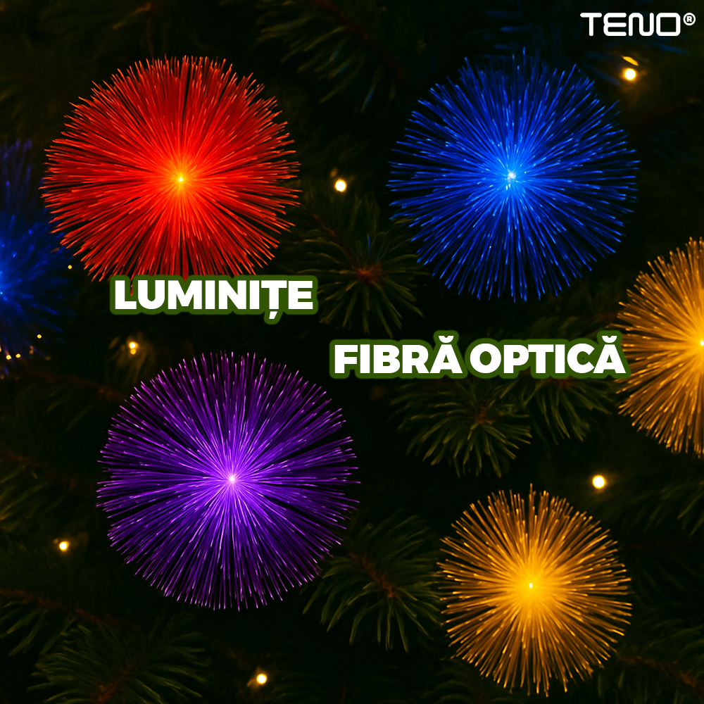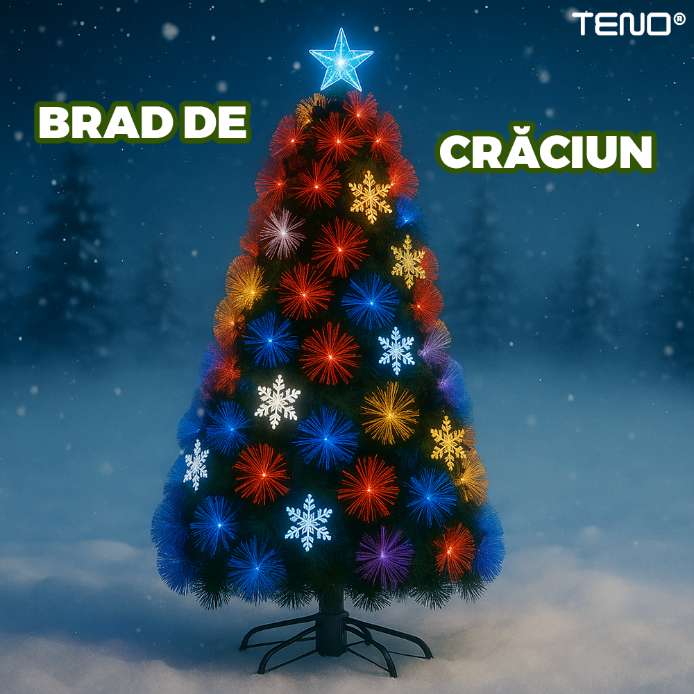 Bradul este decorat cu luminite tip fibra optica, care difuzeaza culori delicate si creeaza un efect spectaculos, modern si elegant. Jocul de lumini se schimba subtil, oferind un spectacol vizual feeric ce completeaza perfect magia Craciunului.