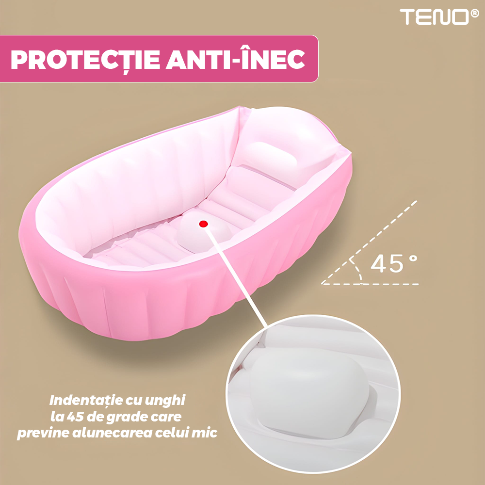Pentru un plus de siguranta, cadita include o zona speciala de protectie anti inec, amplasata in interior. Aceasta mentine bebelusul intr-o pozitie corecta si previne alunecarea in apa, oferind parintilor un plus de liniste in timpul baitei. Designul permite copilului sa stea confortabil, sustinut in mod natural, fara riscul de scufundare accidentala.