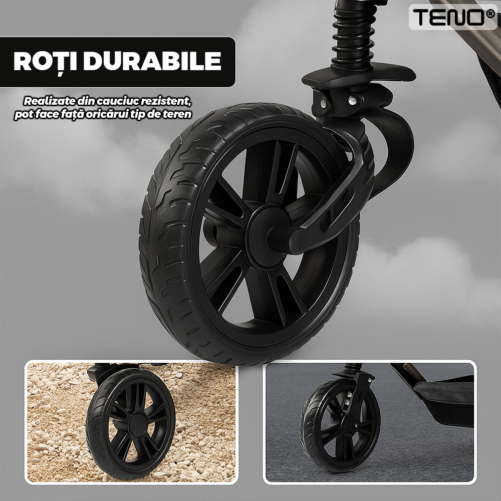 Dotat cu roti durabile din materiale de inalta calitate, caruciorul ofera stabilitate si o deplasare lina chiar si pe terenuri denivelate. Sistemul de suspensie si frana de siguranta adauga un plus de confort si protectie.